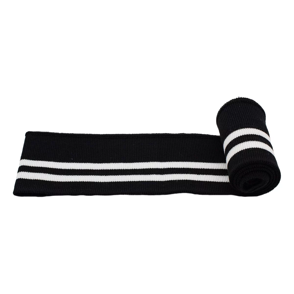 Трикотажный подвяз с контрасными полосами. Подвязы используются при шитье спортивной одежды, одежды для дома и отдыха. Подходят также для замены изношенных деталей: резинок на манжетах и нижней кромке свитера, куртки, толстовки, на поясе брюк и др. Изготовлен из синтетических материалов – полиэстера и спандекса. Полиэстер быстро высыхает, устойчив к износу и не требует использования особых моющих средств. Волокна спандекса придают изделию эластичность – способность растягиваться и при этом сохранять форму. Размеры ленты: ширина 6 см, длина 1 м.
