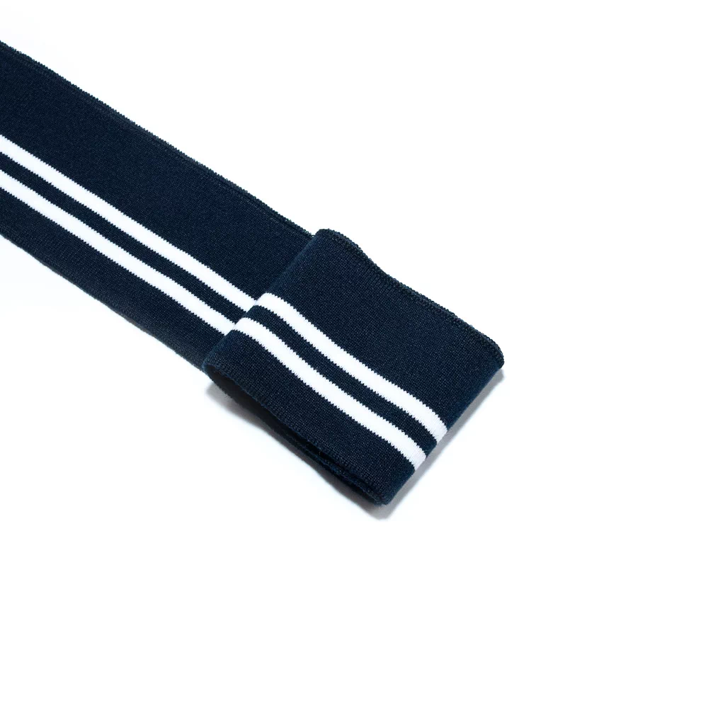 Трикотажный подвяз с контрасными полосами. Подвязы используются при шитье спортивной одежды, одежды для дома и отдыха. Подходят также для замены изношенных деталей: резинок на манжетах и нижней кромке свитера, куртки, толстовки, на поясе брюк и др. Изготовлен из синтетических материалов – полиэстера и спандекса. Полиэстер быстро высыхает, устойчив к износу и не требует использования особых моющих средств. Волокна спандекса придают изделию эластичность – способность растягиваться и при этом сохранять форму. Размеры ленты: ширина 6 см, длина 1 м.
