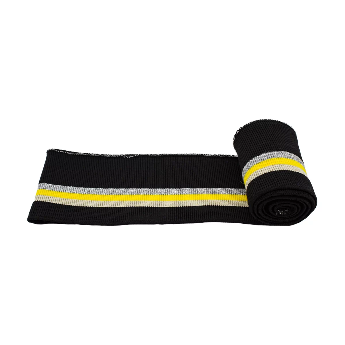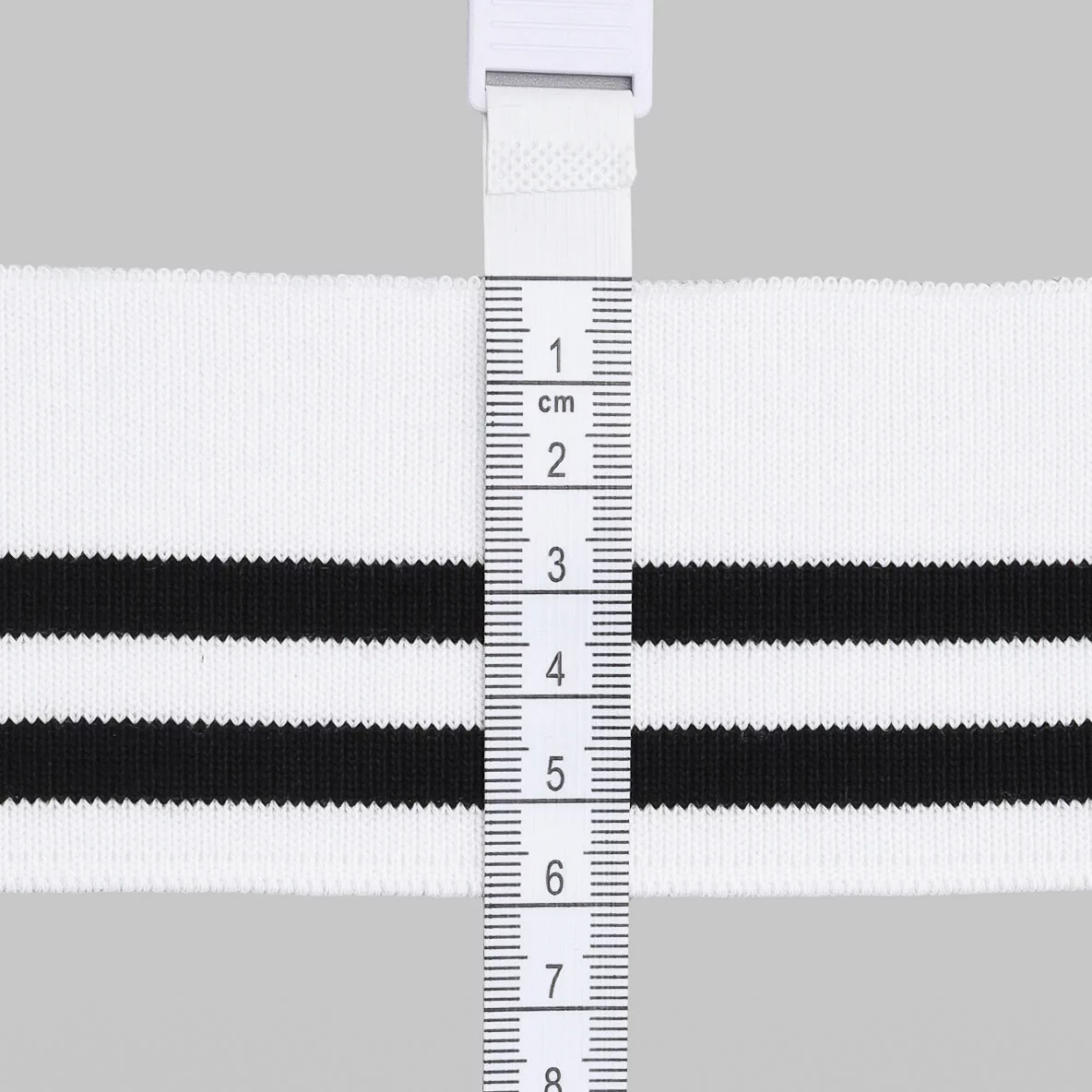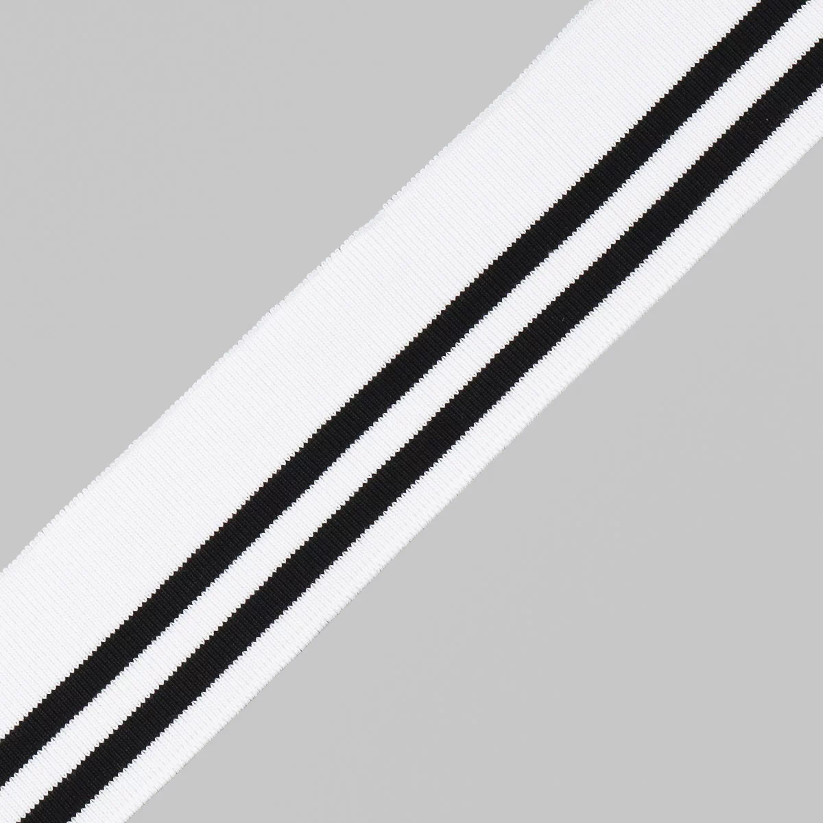 Трикотажный подвяз с контрасными полосами. Подвязы используются при шитье спортивной одежды, одежды для дома и отдыха. Подходят также для замены изношенных деталей: резинок на манжетах и нижней кромке свитера, куртки, толстовки, на поясе брюк и др. Изготовлен из синтетических материалов – полиэстера и спандекса. Полиэстер быстро высыхает, устойчив к износу и не требует использования особых моющих средств. Волокна спандекса придают изделию эластичность – способность растягиваться и при этом сохранять форму. Размеры ленты: ширина 6 см, длина 1 м.