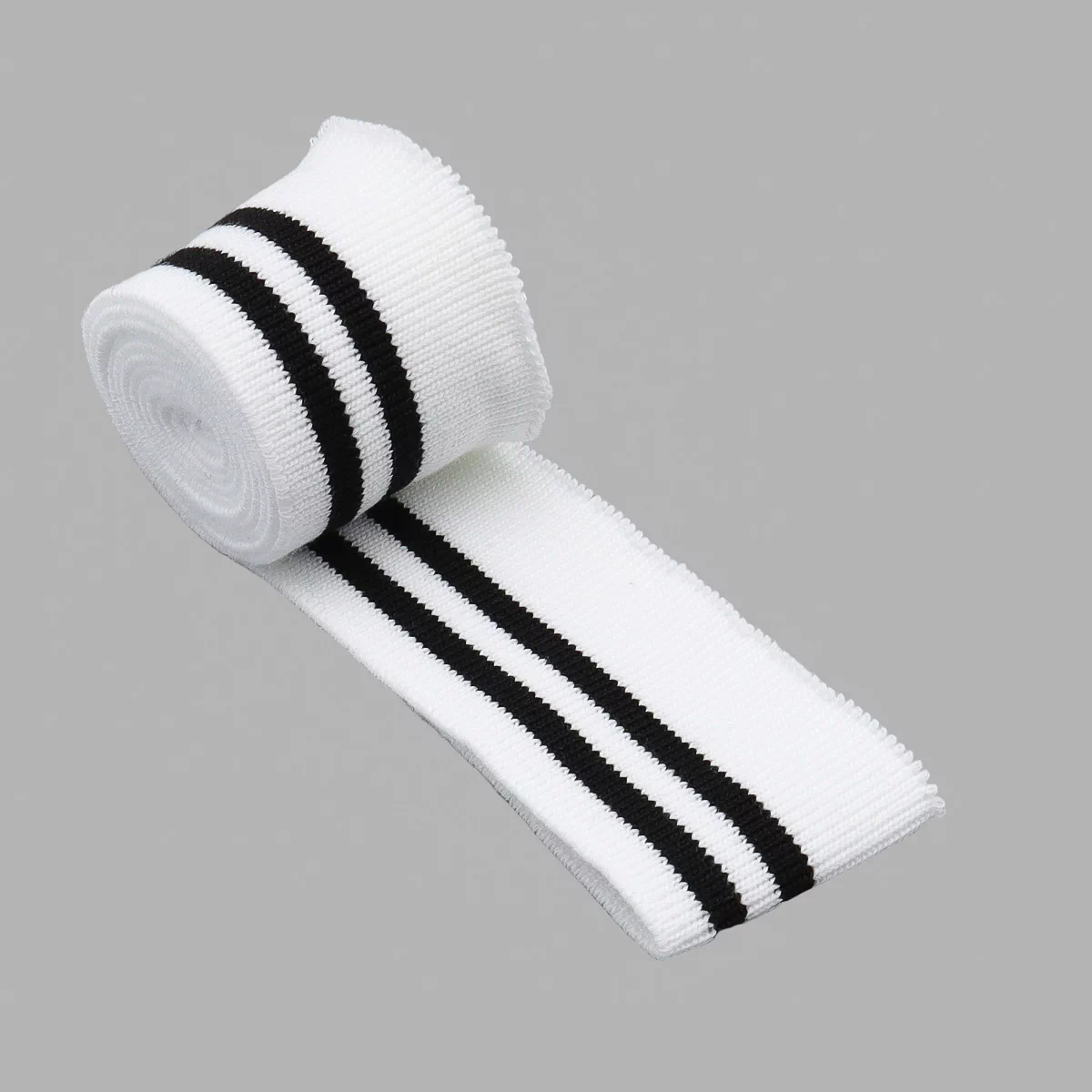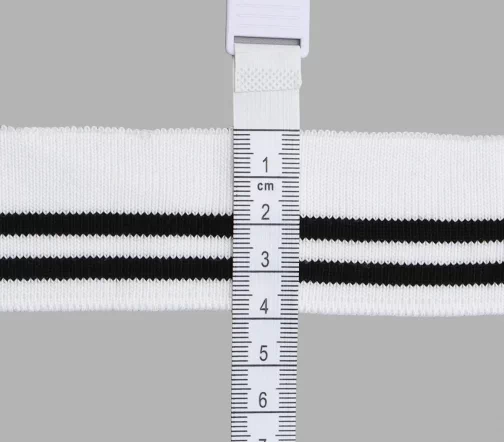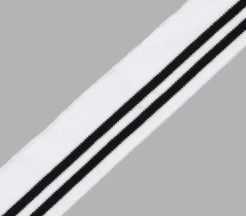 Трикотажный подвяз с контрасными полосами. Подвязы используются при шитье спортивной одежды, одежды для дома и отдыха. Подходят также для замены изношенных деталей: резинок на манжетах и нижней кромке свитера, куртки, толстовки, на поясе брюк и др. Изготовлен из синтетических материалов – полиэстера и спандекса. Полиэстер быстро высыхает, устойчив к износу и не требует использования особых моющих средств. Волокна спандекса придают изделию эластичность – способность растягиваться и при этом сохранять форму. Размеры ленты: ширина 4 см, длина 1 м.