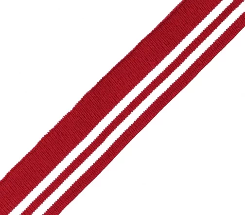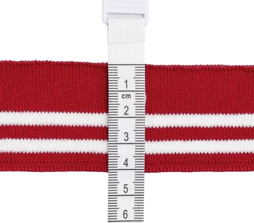 Трикотажный подвяз с контрасными полосами. Подвязы используются при шитье спортивной одежды, одежды для дома и отдыха. Подходят также для замены изношенных деталей: резинок на манжетах и нижней кромке свитера, куртки, толстовки, на поясе брюк и др. Изготовлен из синтетических материалов – полиэстера и спандекса. Полиэстер быстро высыхает, устойчив к износу и не требует использования особых моющих средств. Волокна спандекса придают изделию эластичность – способность растягиваться и при этом сохранять форму. Размеры ленты: ширина 4 см, длина 1 м.