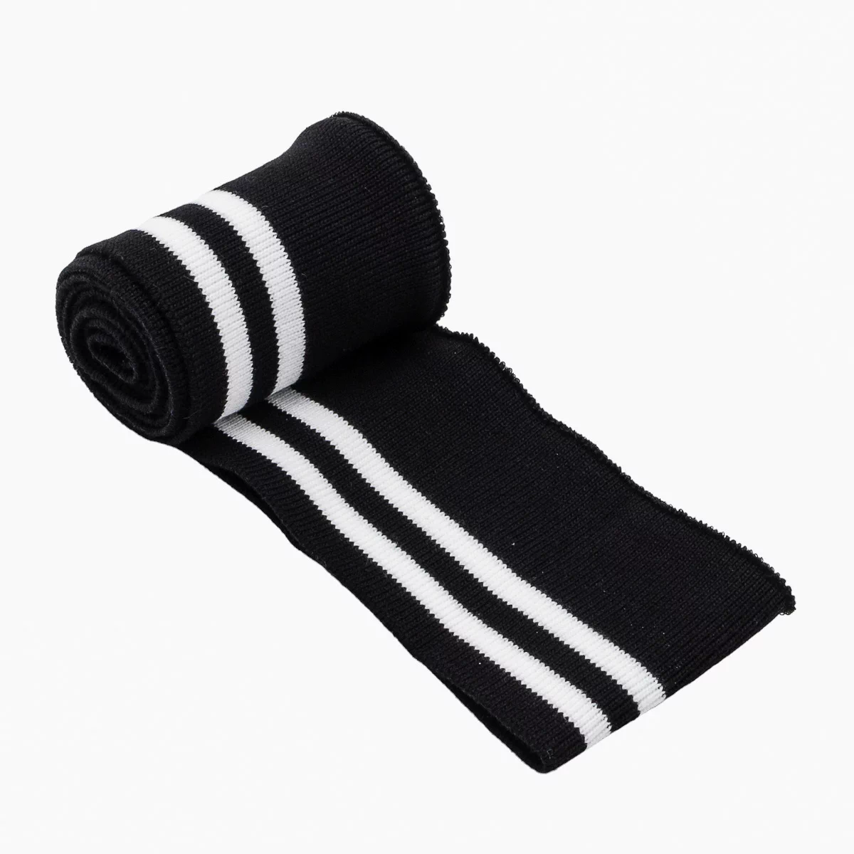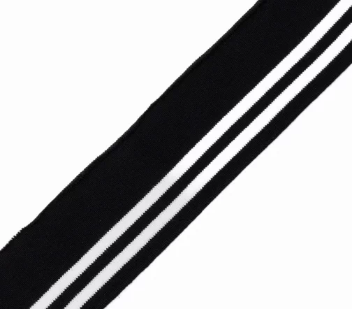 Трикотажный подвяз с контрасными полосами. Подвязы используются при шитье спортивной одежды, одежды для дома и отдыха. Подходят также для замены изношенных деталей: резинок на манжетах и нижней кромке свитера, куртки, толстовки, на поясе брюк и др. Изготовлен из синтетических материалов – полиэстера и спандекса. Полиэстер быстро высыхает, устойчив к износу и не требует использования особых моющих средств. Волокна спандекса придают изделию эластичность – способность растягиваться и при этом сохранять форму. Размеры ленты: ширина 6 см, длина 1 м.