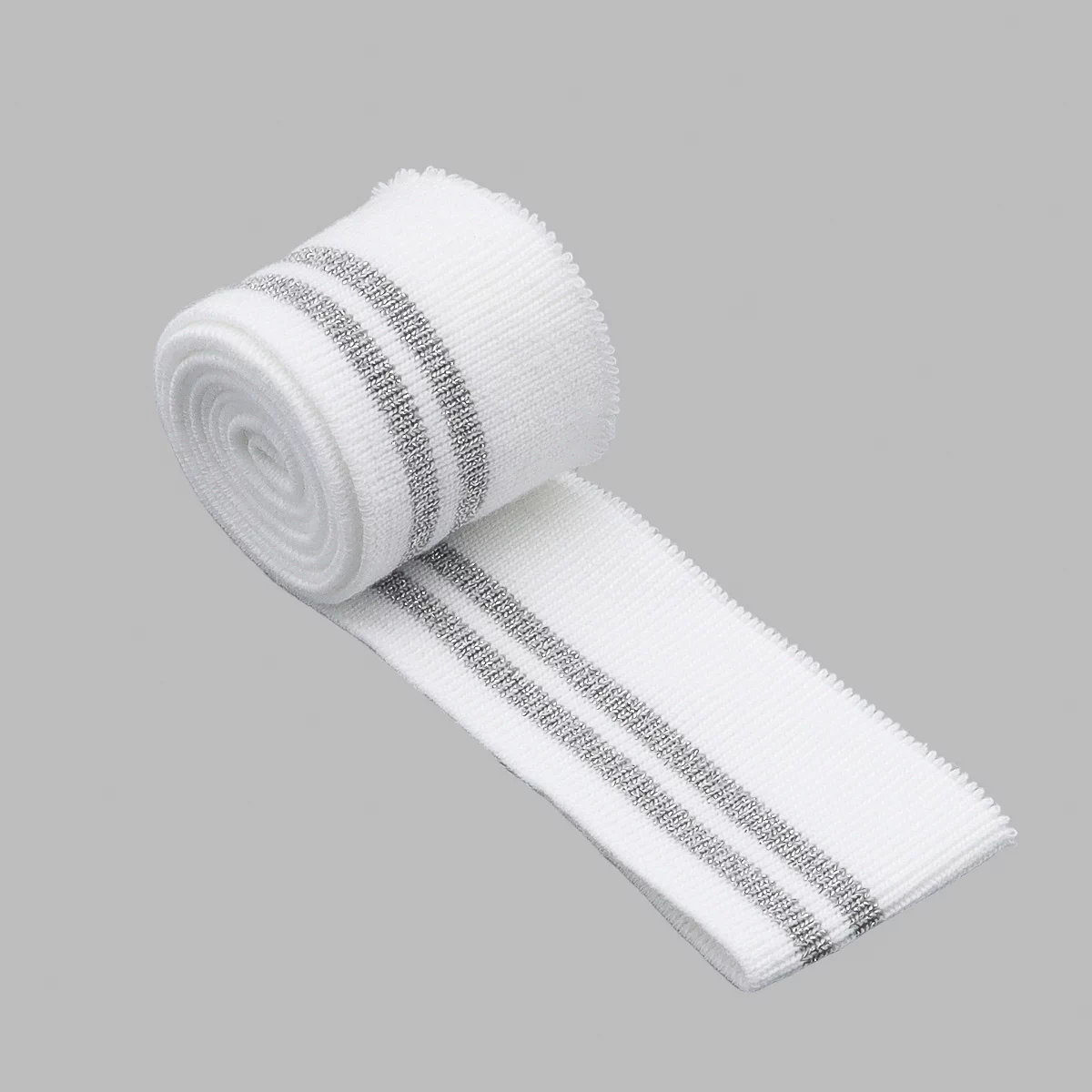 Трикотажный подвяз с контрасными полосами. Подвязы используются при шитье спортивной одежды, одежды для дома и отдыха. Подходят также для замены изношенных деталей: резинок на манжетах и нижней кромке свитера, куртки, толстовки, на поясе брюк и др. Изготовлен из синтетических материалов – полиэстера и спандекса. Полиэстер быстро высыхает, устойчив к износу и не требует использования особых моющих средств. Волокна спандекса придают изделию эластичность – способность растягиваться и при этом сохранять форму. Размеры ленты: ширина 4 см, длина 1 м.