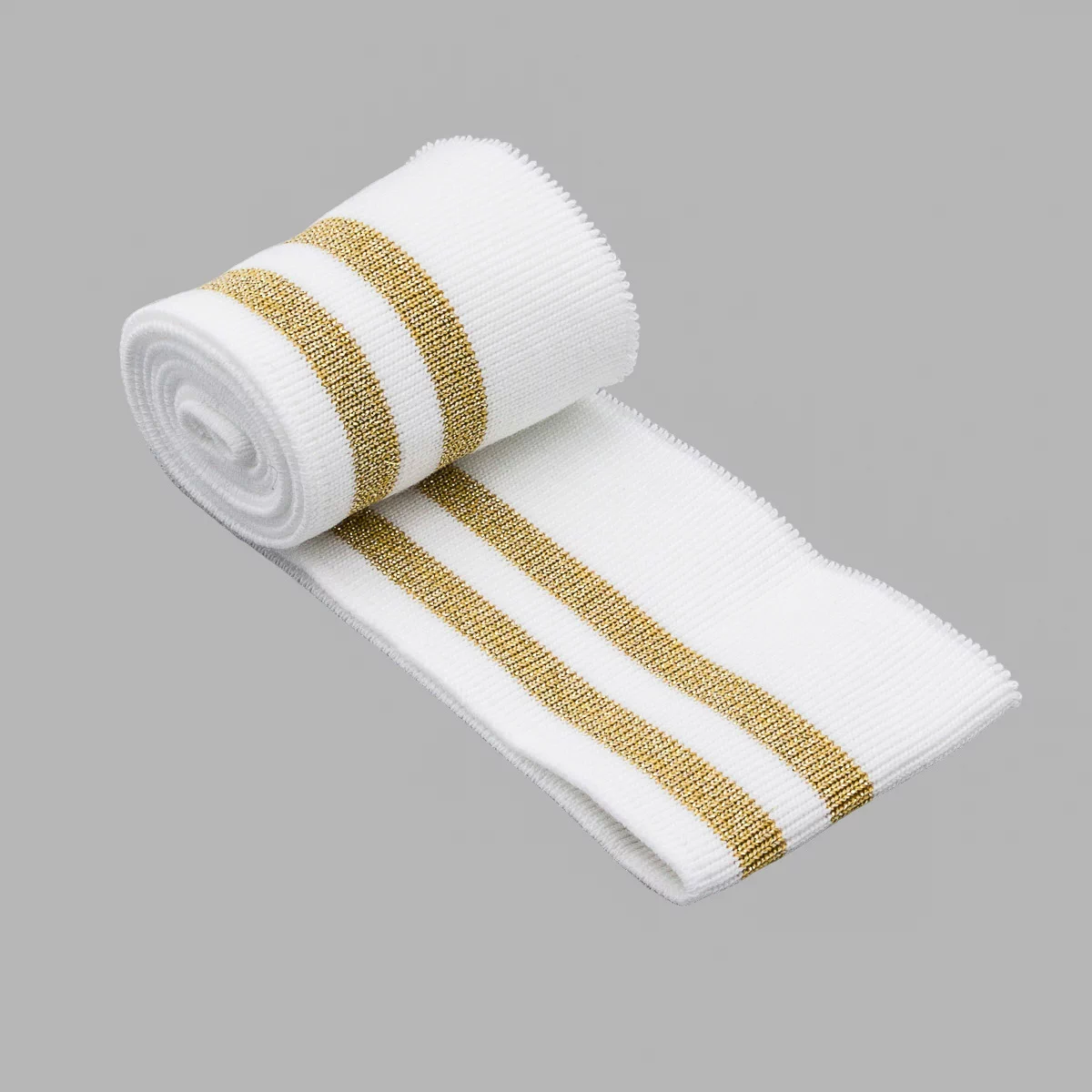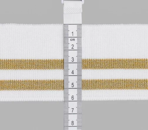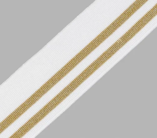 Трикотажный подвяз с контрасными полосами. Подвязы используются при шитье спортивной одежды, одежды для дома и отдыха. Подходят также для замены изношенных деталей: резинок на манжетах и нижней кромке свитера, куртки, толстовки, на поясе брюк и др. Изготовлен из синтетических материалов – полиэстера и спандекса. Полиэстер быстро высыхает, устойчив к износу и не требует использования особых моющих средств. Волокна спандекса придают изделию эластичность – способность растягиваться и при этом сохранять форму. Размеры ленты: ширина 6 см, длина 1 м.