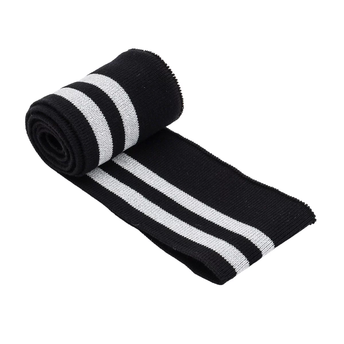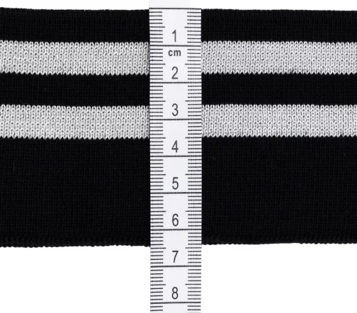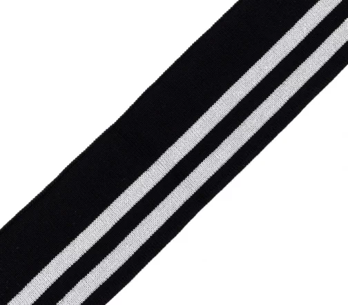Трикотажный подвяз с контрасными полосами. Подвязы используются при шитье спортивной одежды, одежды для дома и отдыха. Подходят также для замены изношенных деталей: резинок на манжетах и нижней кромке свитера, куртки, толстовки, на поясе брюк и др. Изготовлен из синтетических материалов – полиэстера и спандекса. Полиэстер быстро высыхает, устойчив к износу и не требует использования особых моющих средств. Волокна спандекса придают изделию эластичность – способность растягиваться и при этом сохранять форму. Размеры ленты: ширина 6 см, длина 1 м.