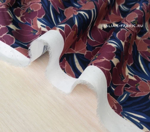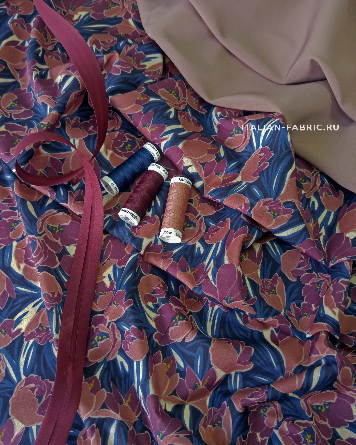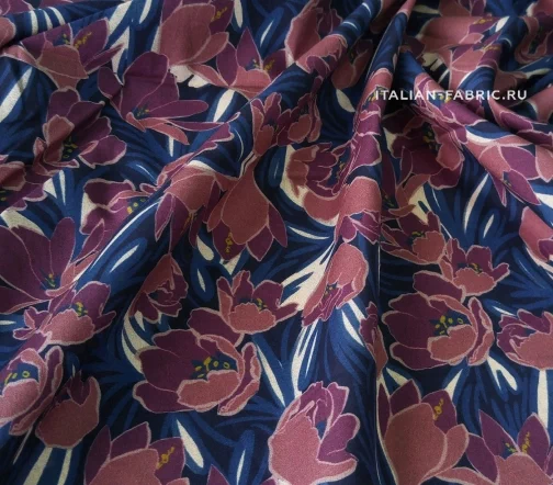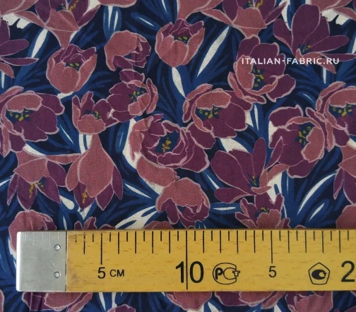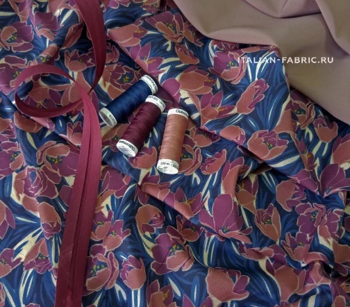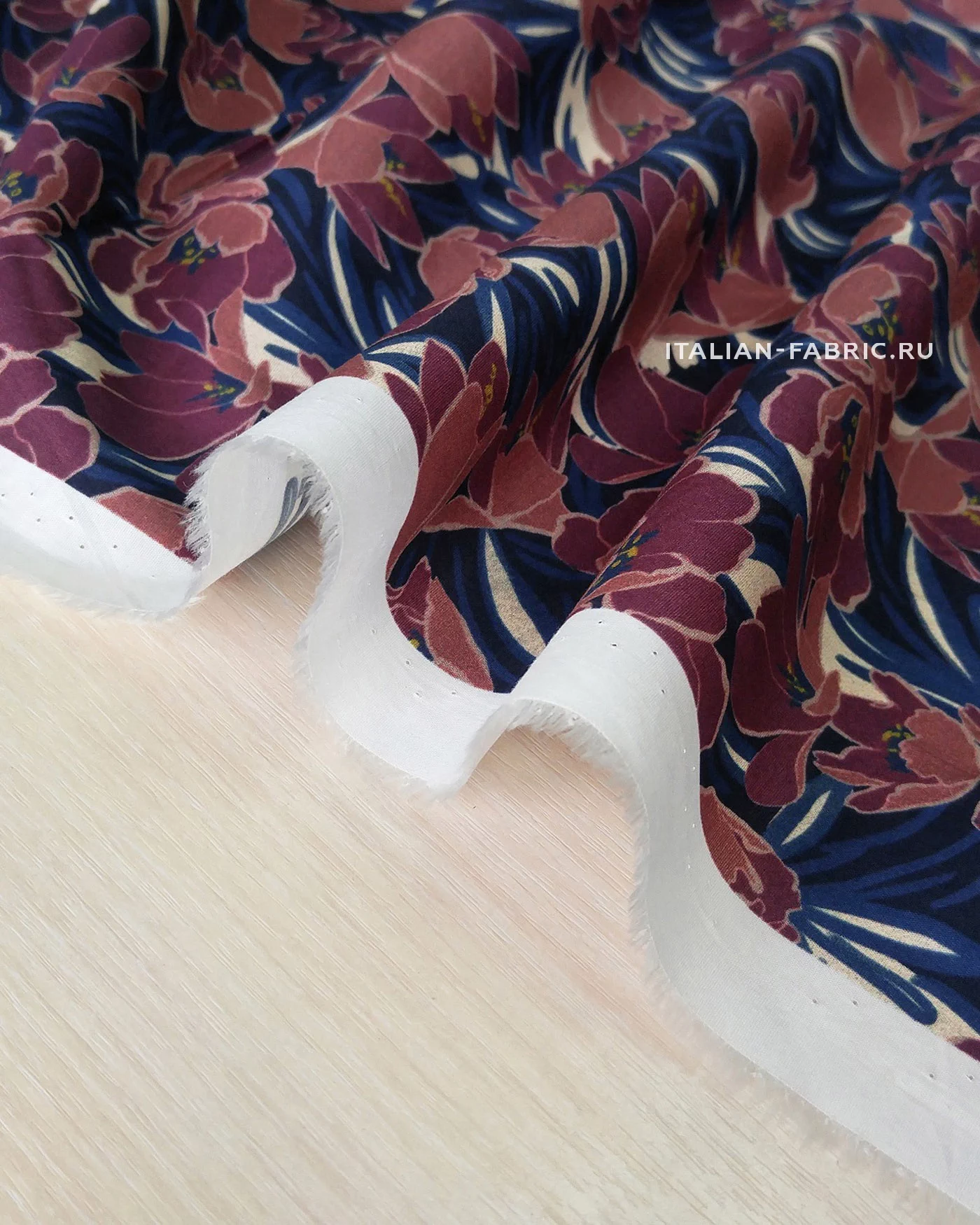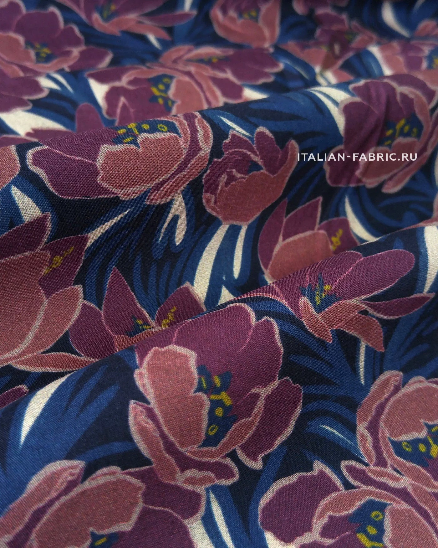Изумительно красивый поплин с чудесным цветочным принтом! Материал роскошно мягкий и приятный к коже. Тонкий хлопок со стилизованными тюльпанами в изумительных оттенках баклажанового и пепельно-розового цветов на черно-синем фоне. Для пошива блузок, а также платьев и юбок на подкладе.