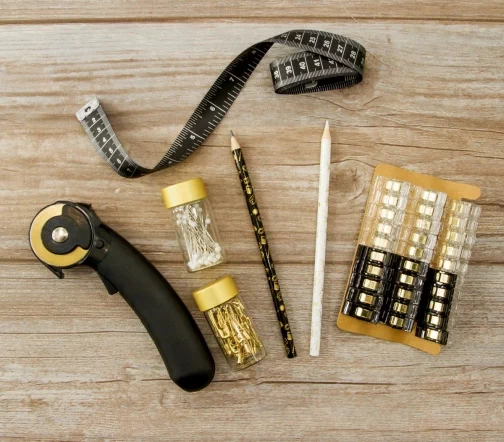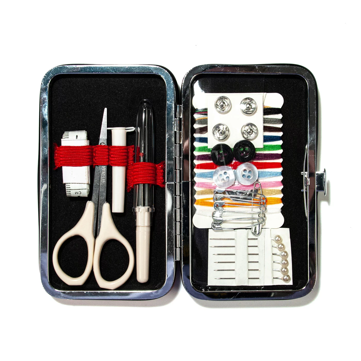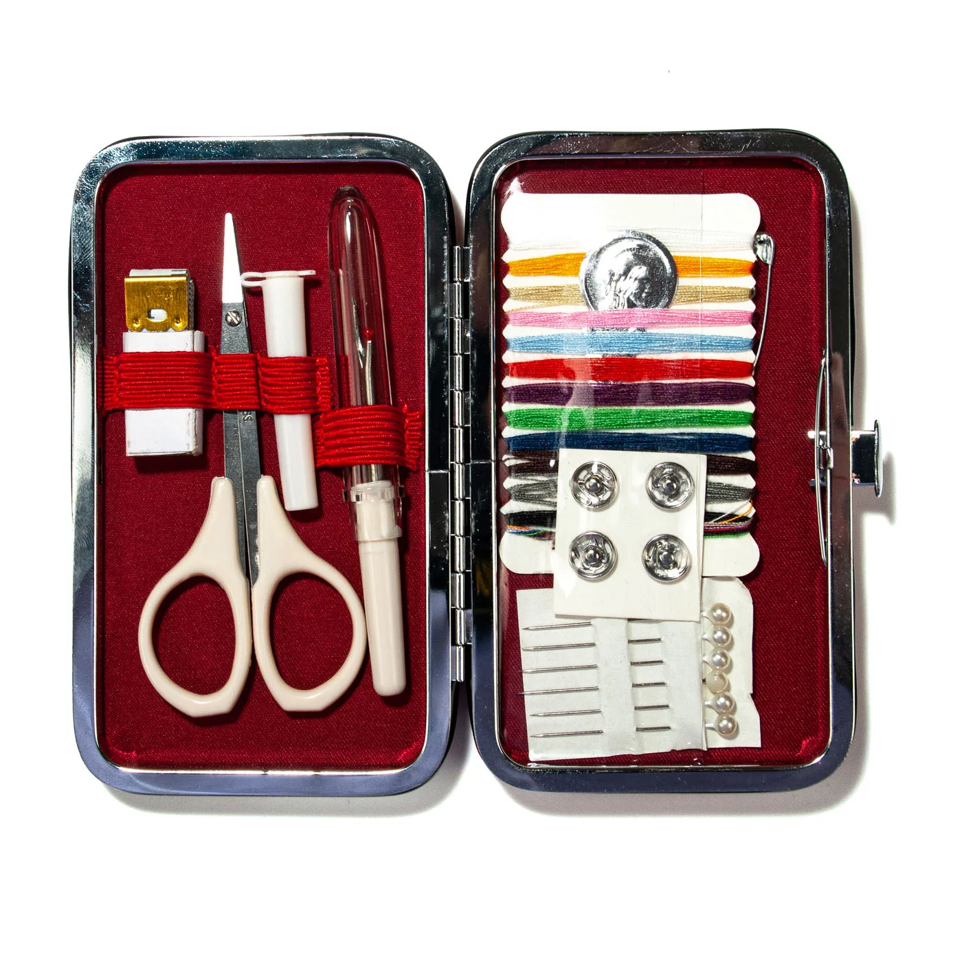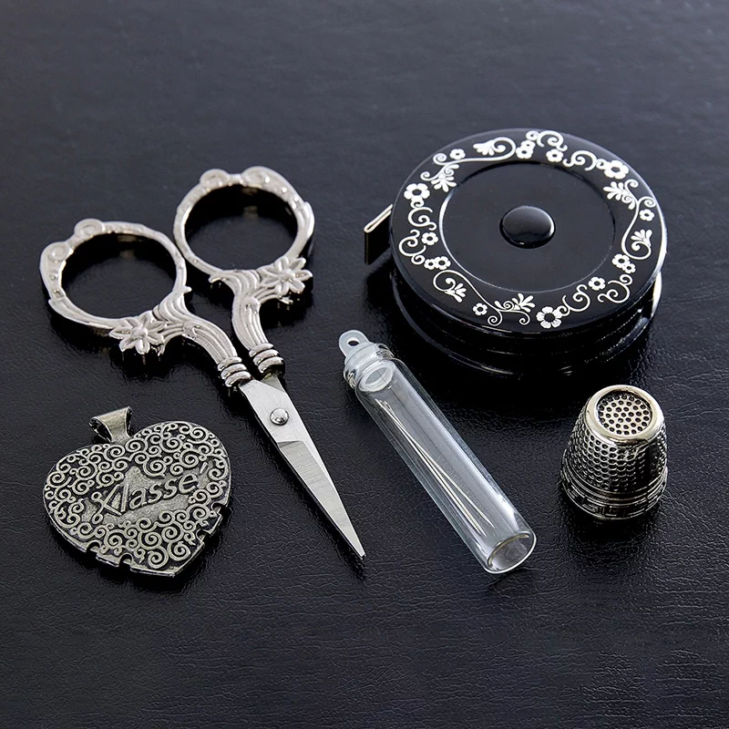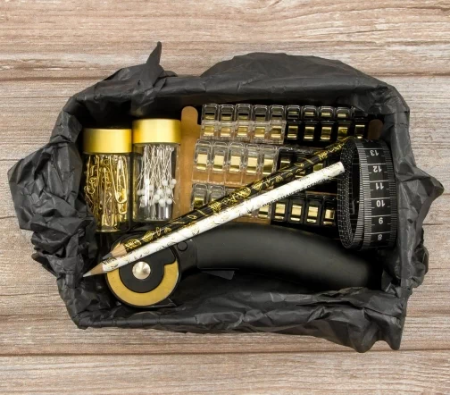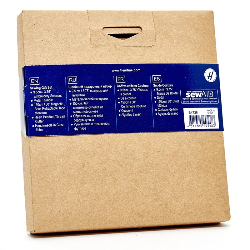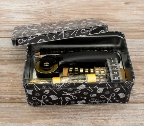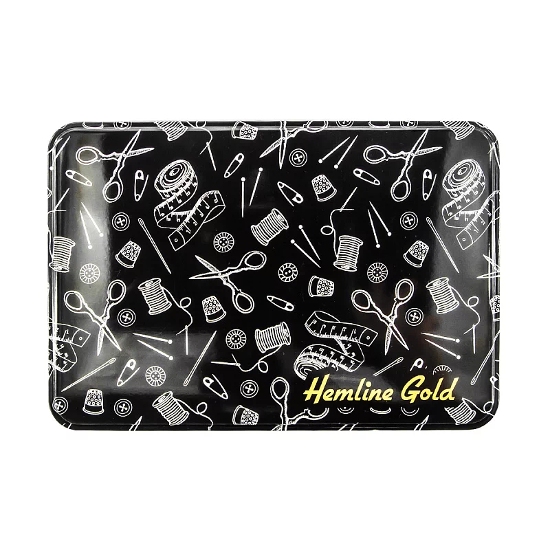 Швейный набор Hemline Gold в жестяной коробке премиум класса. В набор входят: нитевдеватель для ручных и машинных игл с пластиковой ручкой - 2 шт. (1 белый/1 черный), наперсток с кантом против скольжения, размер 17, иглы ручные для домашнего хозяйства в баночке №19, 5,7,8 - 10 шт., ножницы для вышивания 13 см.