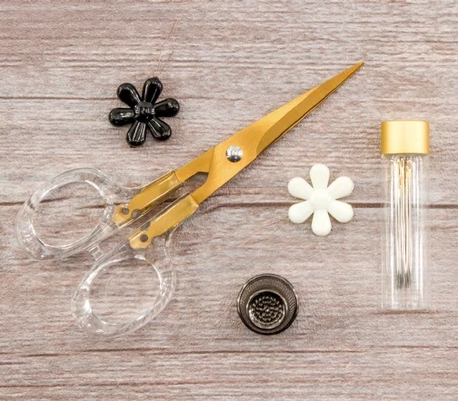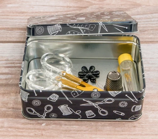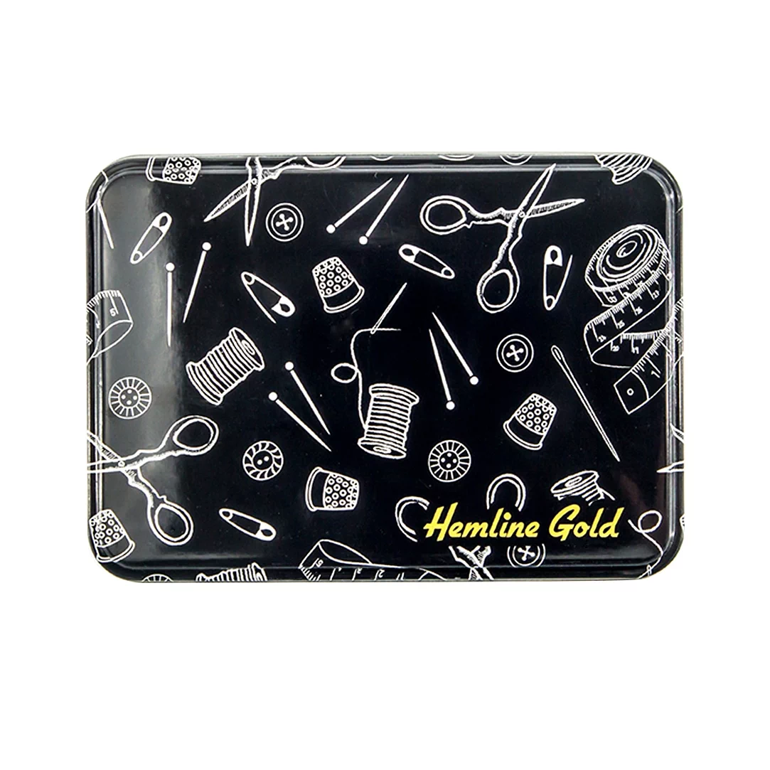 Швейный набор Hemline Gold в жестяной баночке премиум класса. В набор входят: нитевдеватель для ручных и машинных игл с пластиковой ручкой, 2 шт (1 белый/1 черный), наперсток с кантом против скольжения, размер 17, иглы ручные для домашнего хозяйства в баночке №19, 5,7,8, 10 шт, ножницы для вышивания, 13 см. Размер изделия - 12 х 8,5 х 4,3 см.