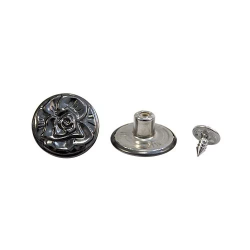 Пуговицы такой конструкции используются при изготовлении одежды и других изделий из джинсовой ткани, брезента. Джинсовая пуговица выполнена из качественного металла. Состоит из двух частей: верхняя шляпка и гвоздь с круговой насечкой. Отдельное внимание хотелось бы обратить на дизайн. Шляпка пуговицы – традиционно круглой формы, цвета 'черный никель', по всему диаметру украшена шикарной фактурной розой, у которой выделен каждый лепесток. Данную пуговицу можно легко установить в домашних условиях с помощью пресса, киянки или молотка. Это важная деталь, если вы занимаетесь ремонтом и пошивом верхней одежды, кожгалантереи, рюкзаков и т. д.
