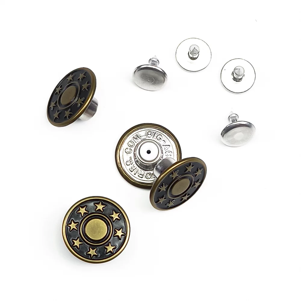 Пуговицы такой конструкции используются при изготовлении одежды и других изделий из джинсовой ткани, брезента. Джинсовая пуговица выполнена из качественного металла. Состоит из двух частей: верхняя шляпка и гвоздь с круговой насечкой. Данную пуговицу можно легко установить в домашних условиях с помощью пресса, киянки или молотка. Это важная деталь, если вы занимаетесь ремонтом и пошивом верхней одежды, кожгалантереи, рюкзаков и т. д.