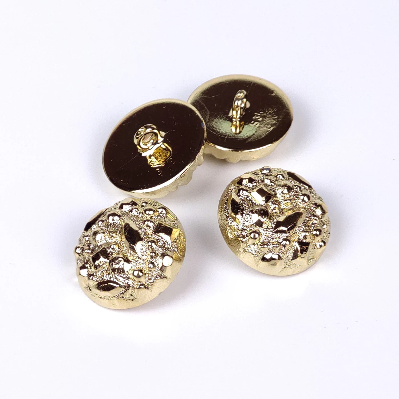 Красивая костюмно-пальтовая пуговица из металлизированной пластмассы золотого цвета.
