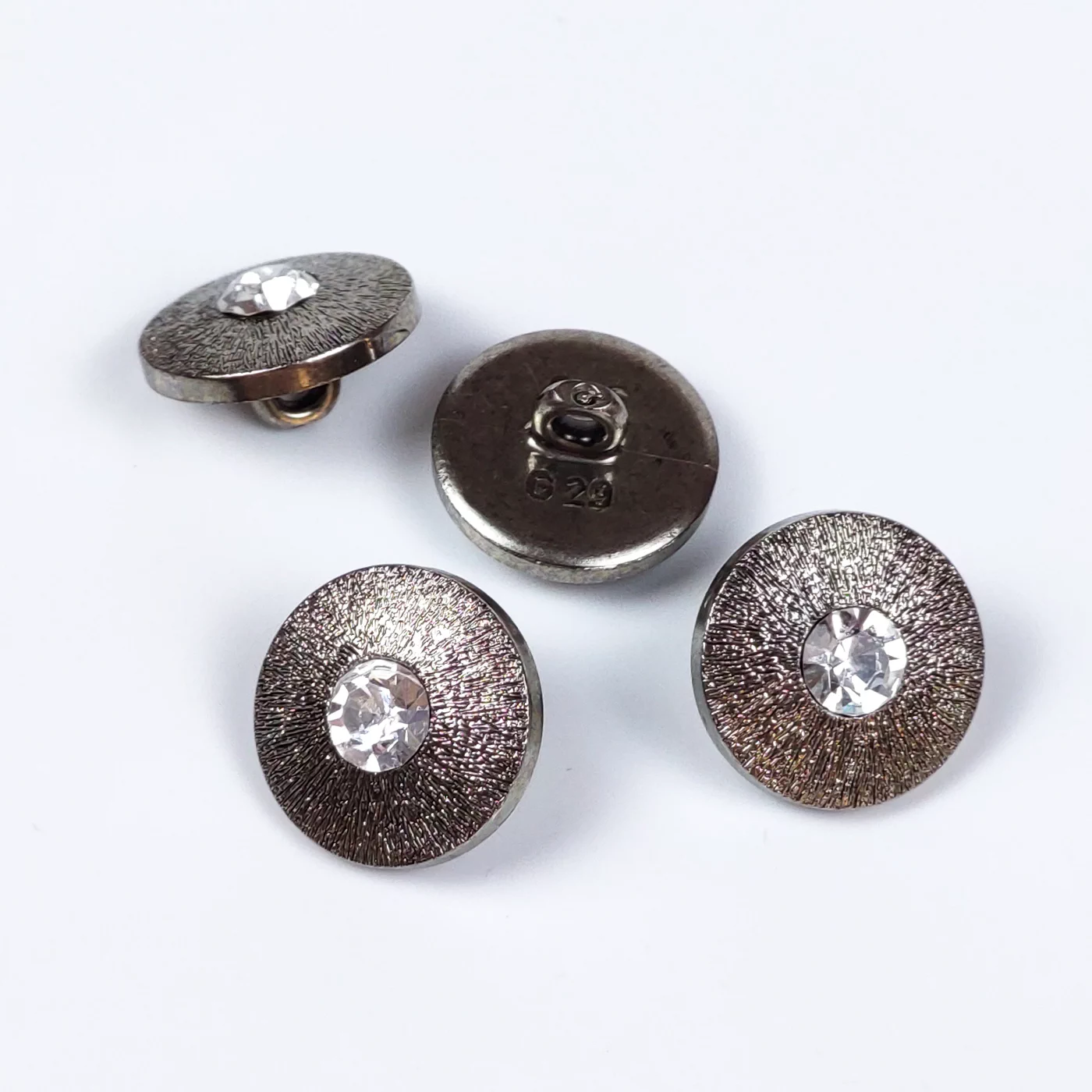 Изящная плательно-костюмная пуговица со стразом под металл в цвете никель.