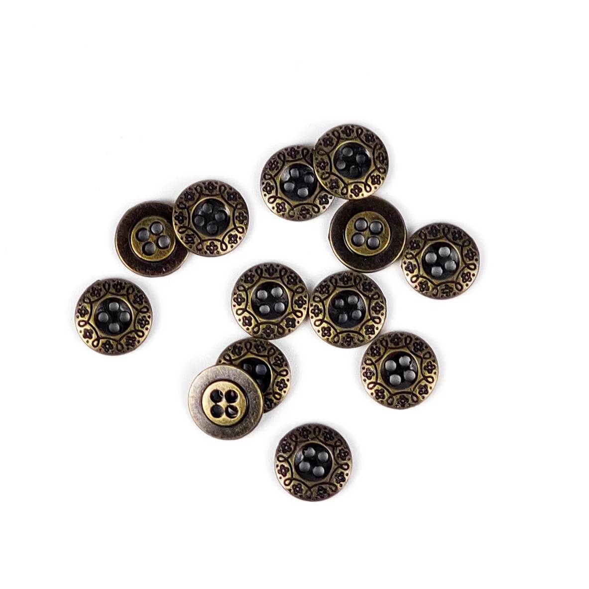 Пуговицы, Union Knopf, "Круглые с узором цветки", 4 отв., металл, цвет состаренное золото, 11 мм.