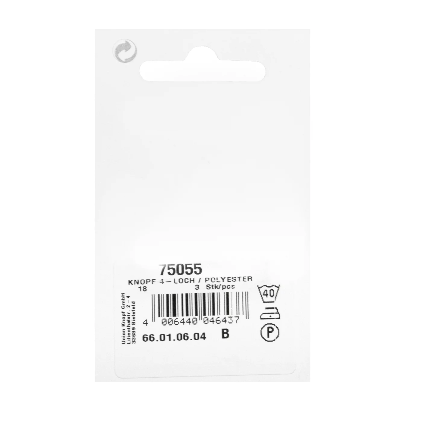 Пуговицы, Union Knopf, 4 отв., пластик, цв. белый, 18 мм, 3 шт., 75055