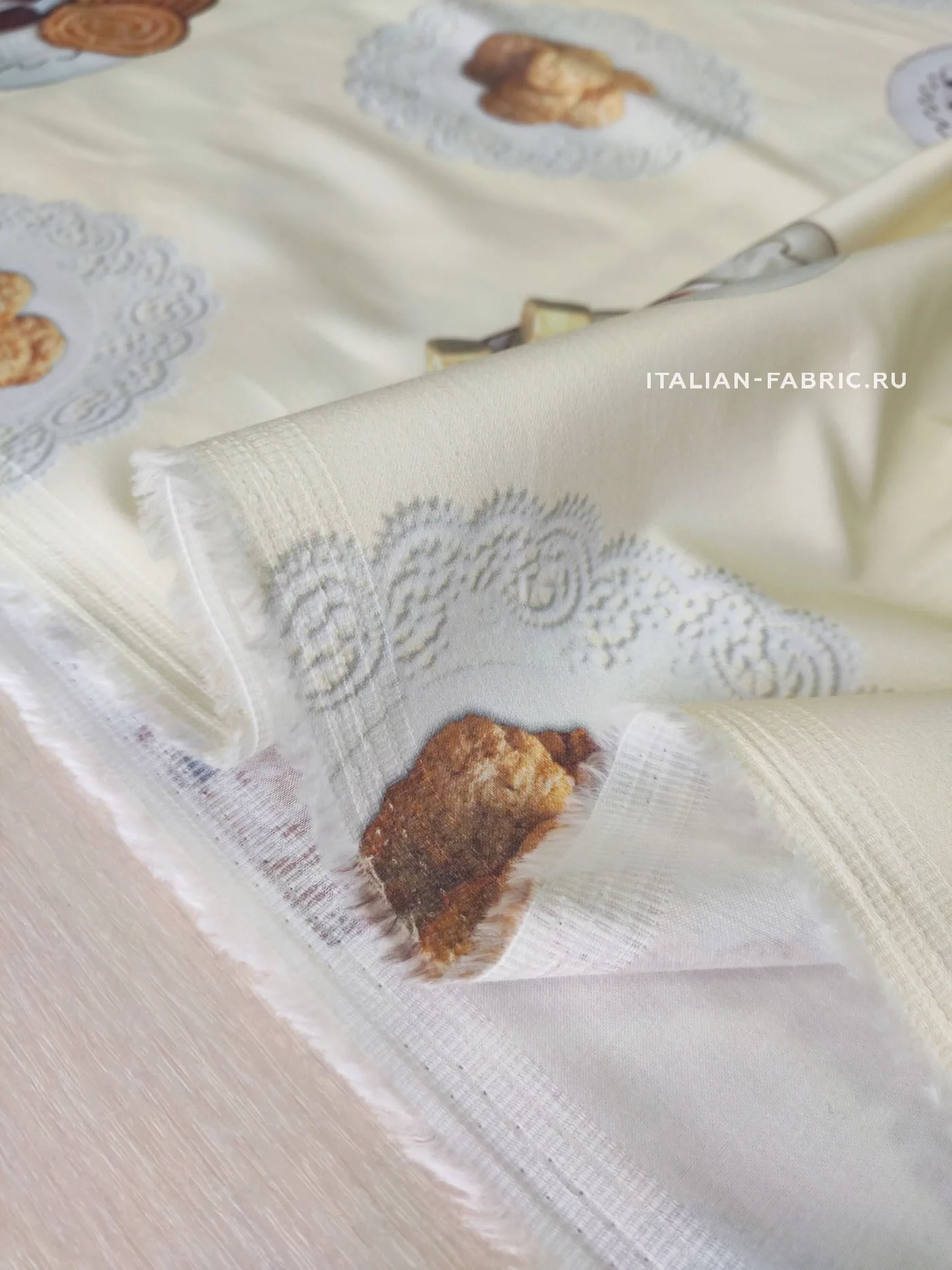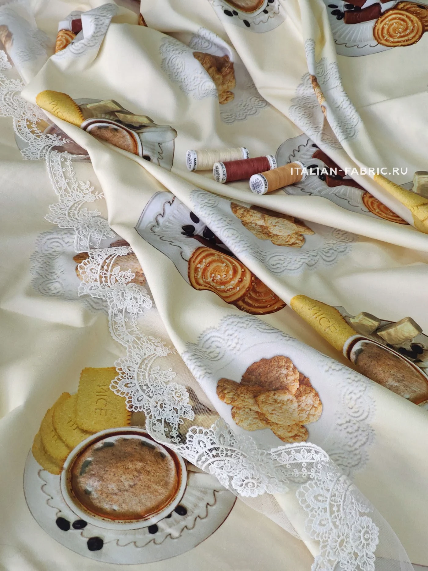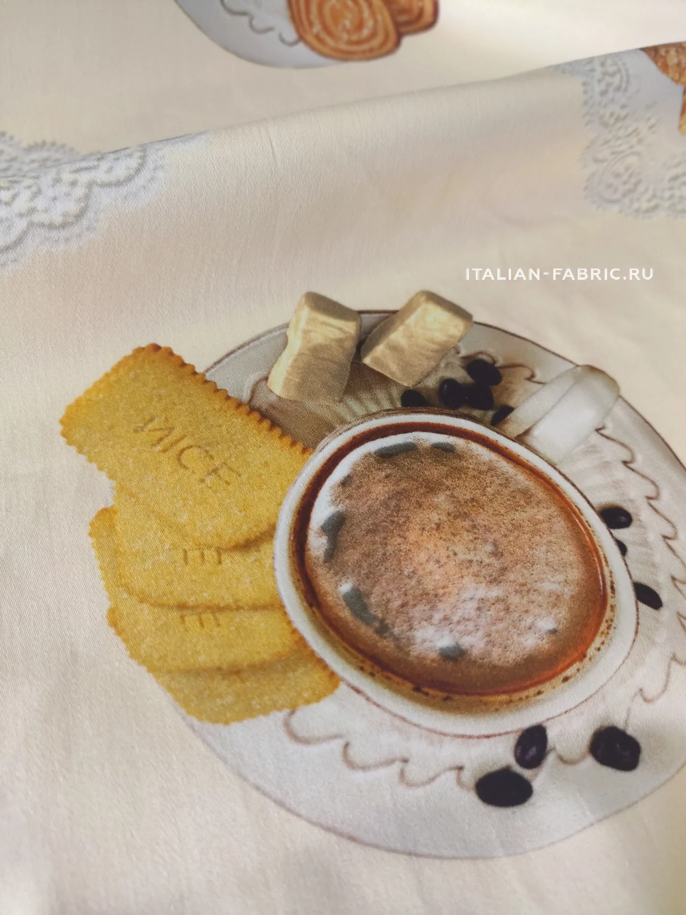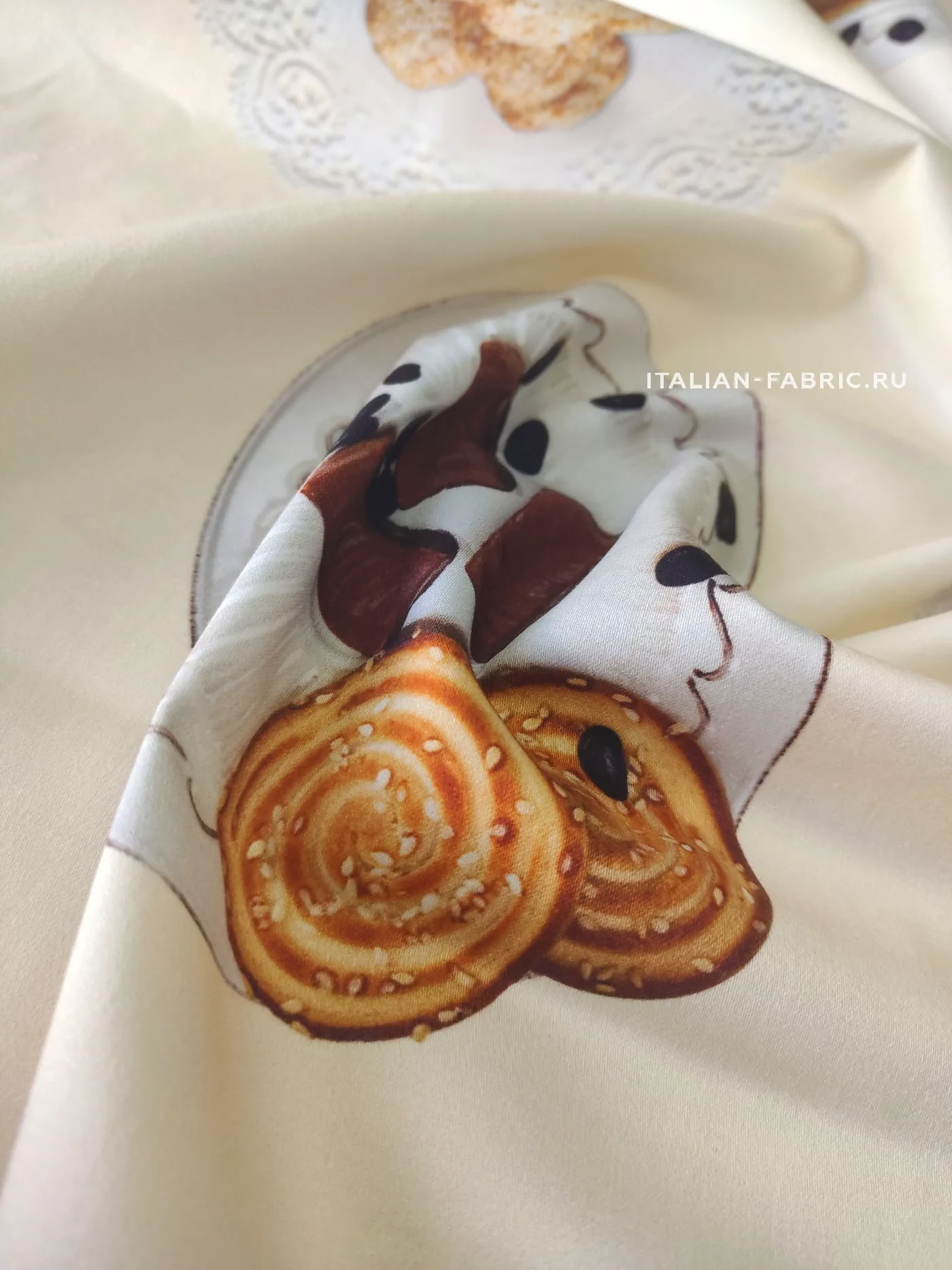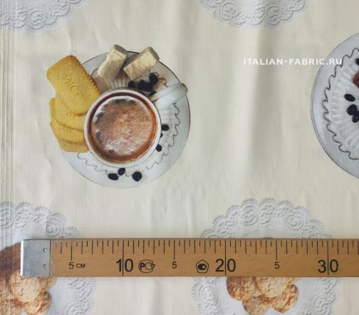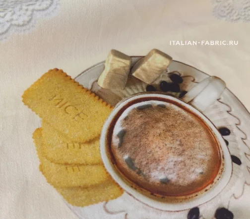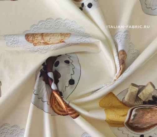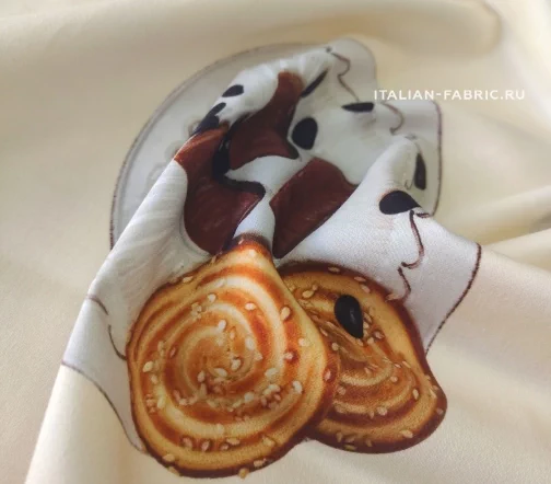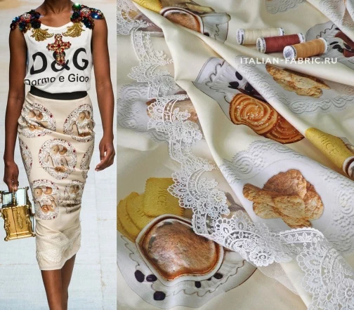 Доменико Дольче и Стефано Габбана любят удивлять неординарными вкусными принтами. Сатин линии Dolce&Gabbana с изображением свежезаваренного кофе, конфет и печенья на милых ажурных салфеточках. Благодаря дорогостоящей inkjet фотопечати и качеству итальянских красителей, изображение лакомств выглядит настолько натурально, что хочется их съесть! Для пошива ярких и эффектных юбок, платьев и топов.