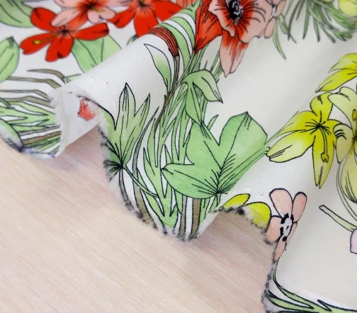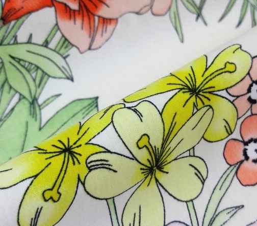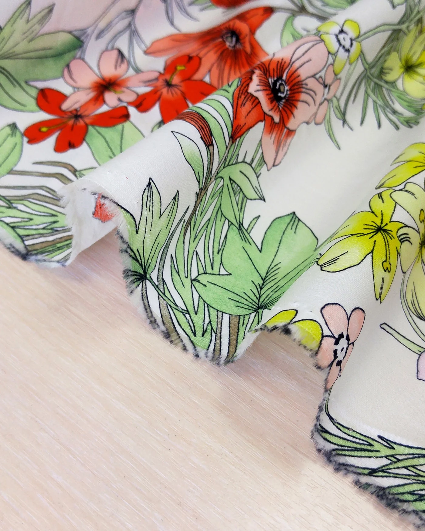 Яркий цветочный принт для эффектных летних изделий – юбок, платьев, топов, рубашек, брюк и легких жакетов. Итальянский сатин самого высокого качества – мягкий и приятный тактильно; средней плотности. Принт с тропическими цветами очень красивый и сочный, фон - молочный.
