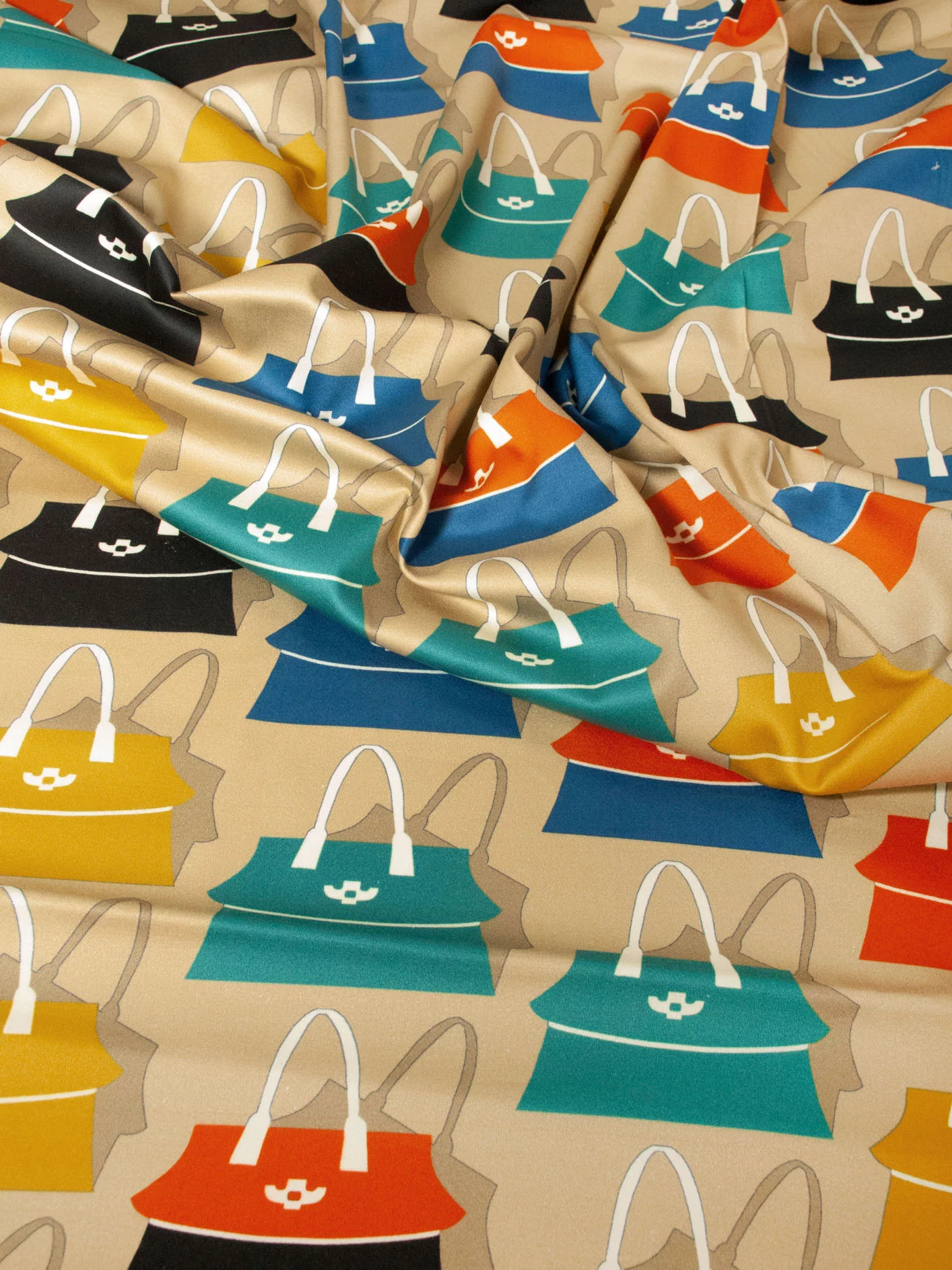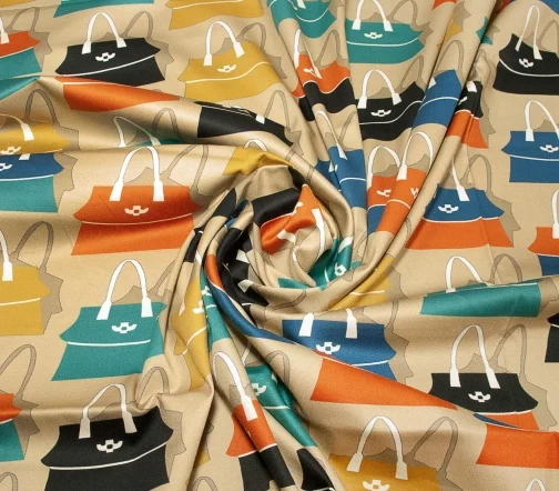 Сатин изумительный по качеству и тактильным ощущением. Средней плотности, пластичный за счет содержания эластана в ткани. Лицевая сторона матовая. Принт сумочки 9,0 х 10,0 см.