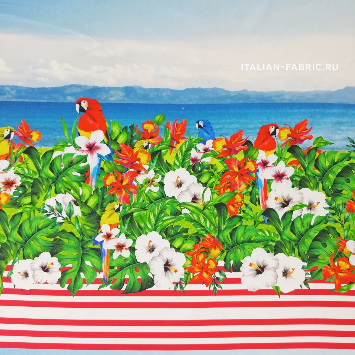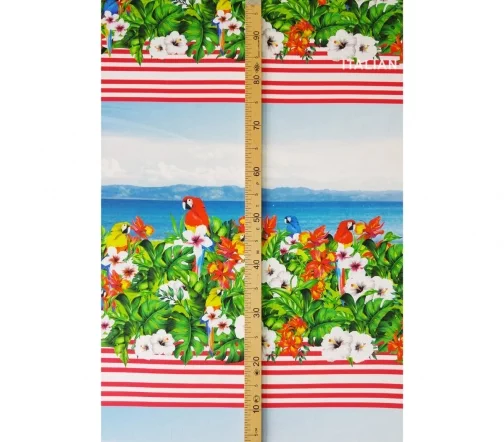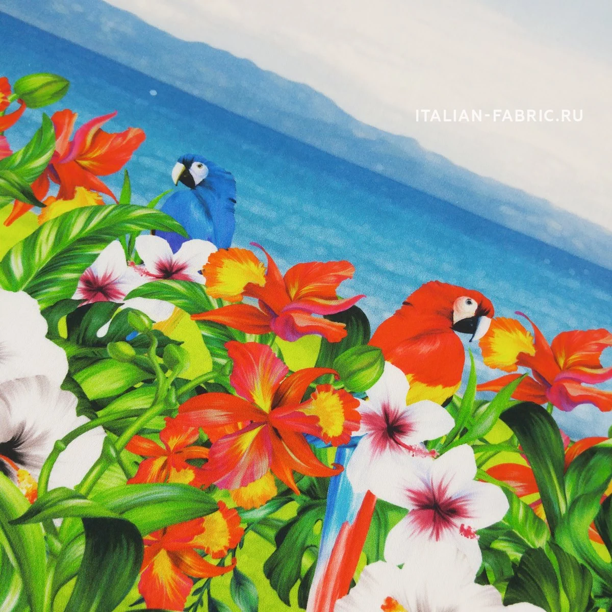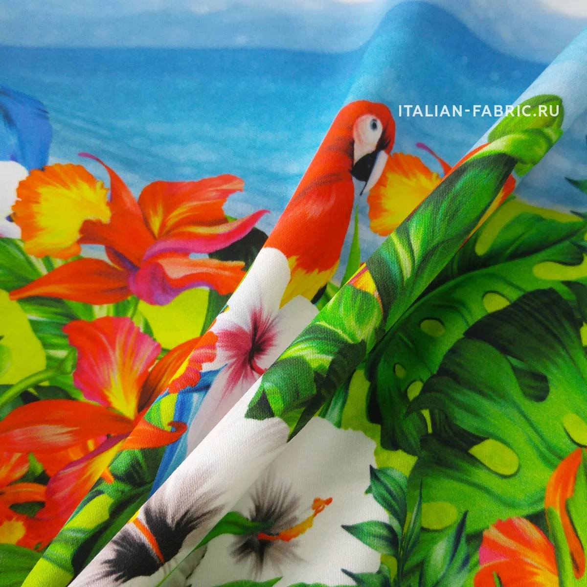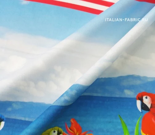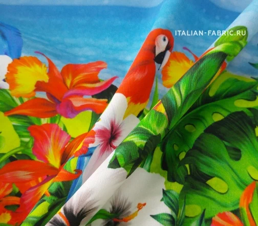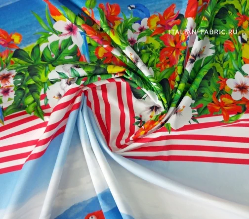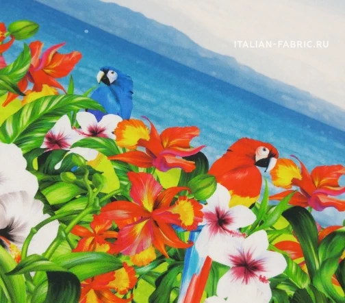 Жизнерадостный рисунок с попугаями, яркими цветами и морским видом на великолепном итальянском сатине. Платье, сарафан или юбка с тропической тематикой – must have этого летнего сезона! Сатин изумительный по качеству и тактильным ощущениям. Средней плотности, пластичный за счет содержания эластана. Хорошо держит форму. Лицевая сторона матовая.