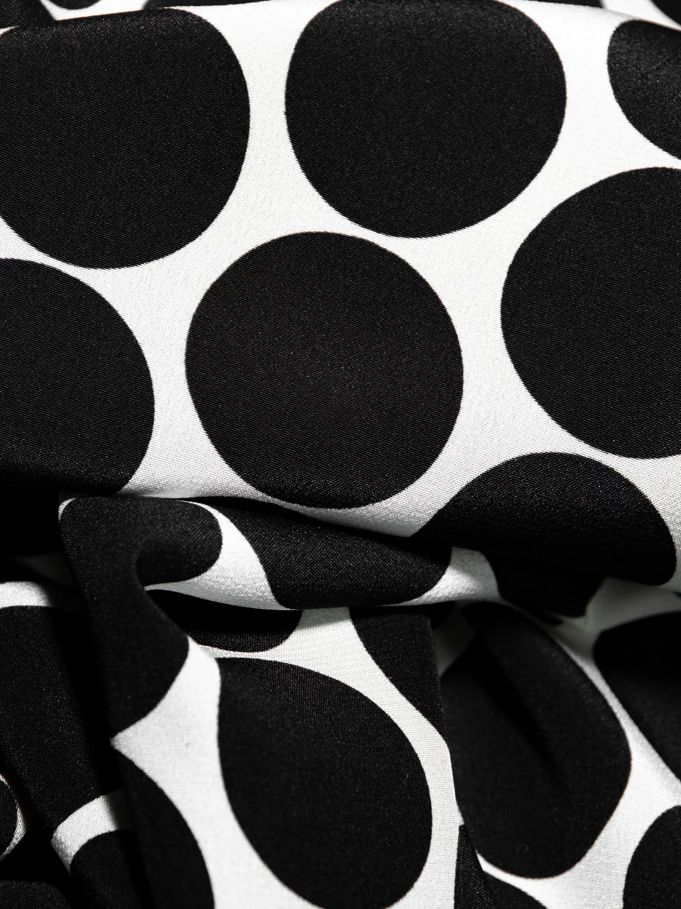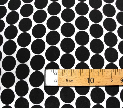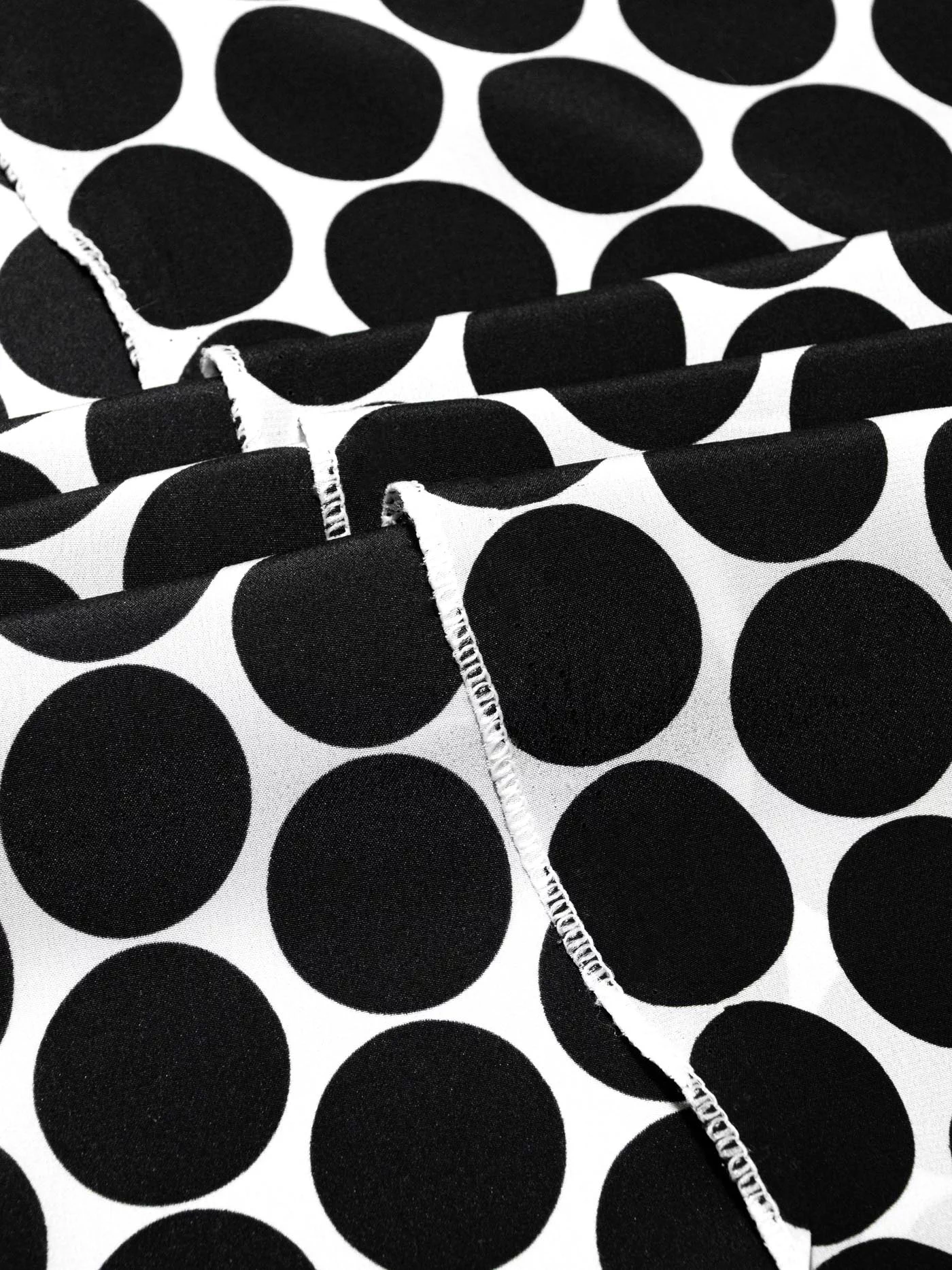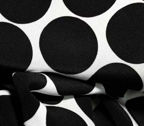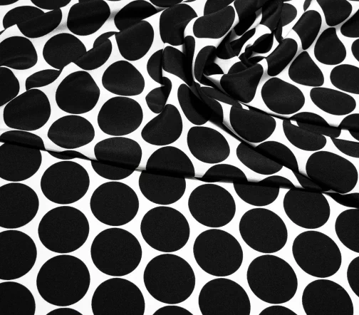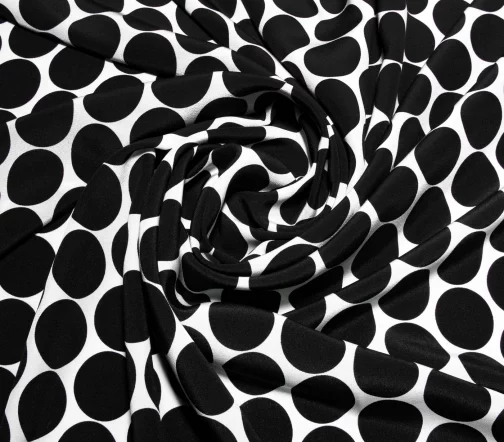 Тонкая ткань из шелка с креповой фактурой в классической черно-белой расцветке узора в горошек. Размер горошка примерно 3,5 см. Жоржет просвечивает, воздушно и пластично драпируется, приятный к телу - будет нарядно выглядеть в роли блузы, платья или летящей юбки.