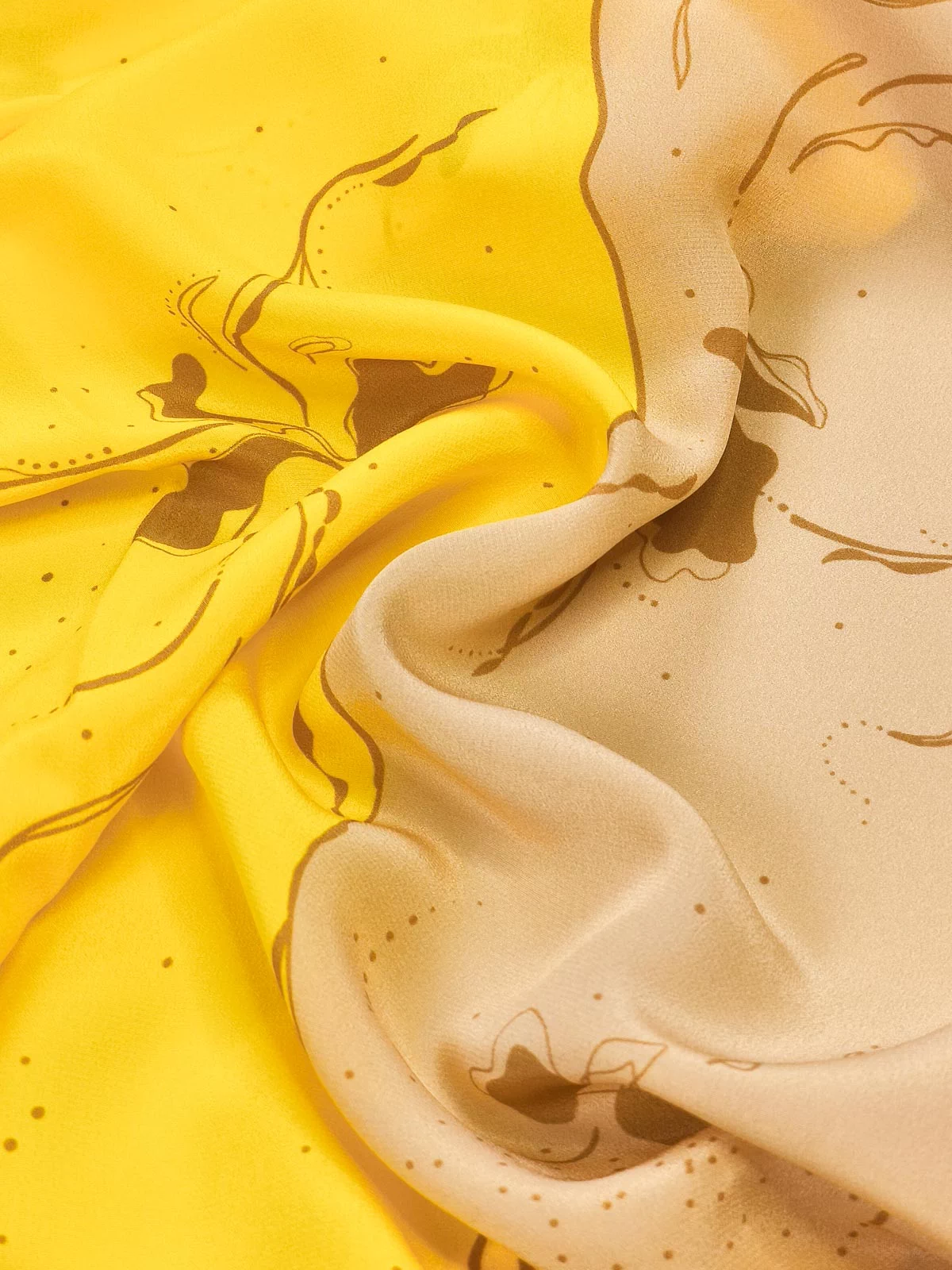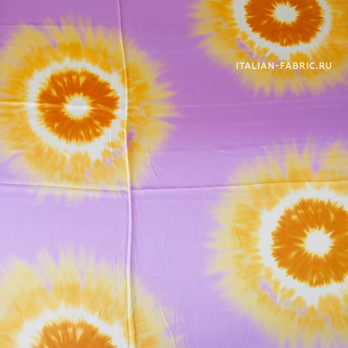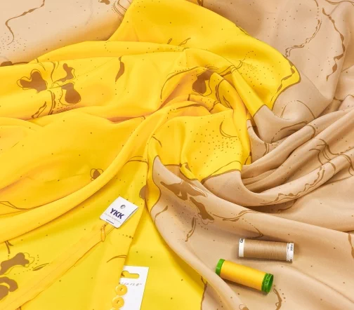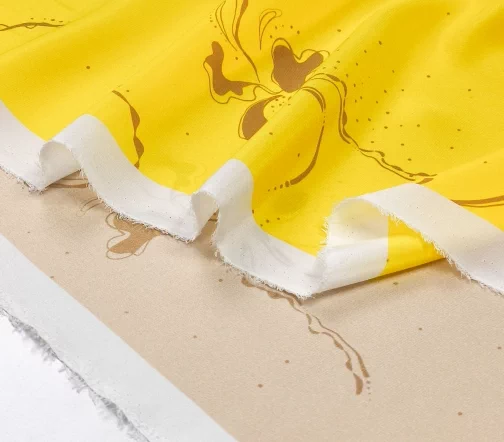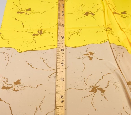 Принт нанесен очень оригинально вдоль кромок, разделяя ширину ткани примерно 2 к 3: светло-бежевая часть с розовой ноткой 50-55 см от кромки, желтая - 80-85 см.