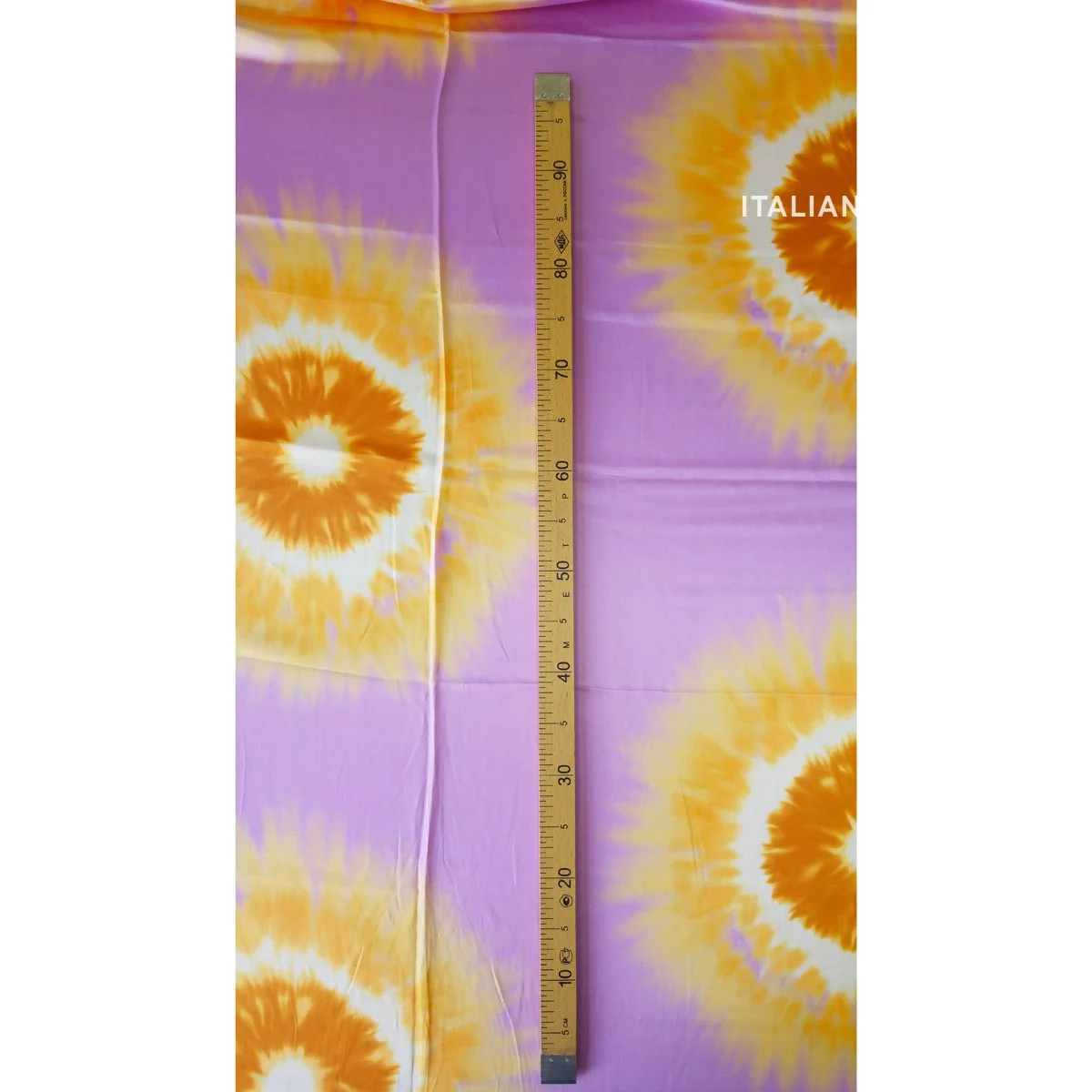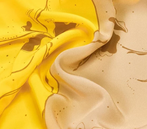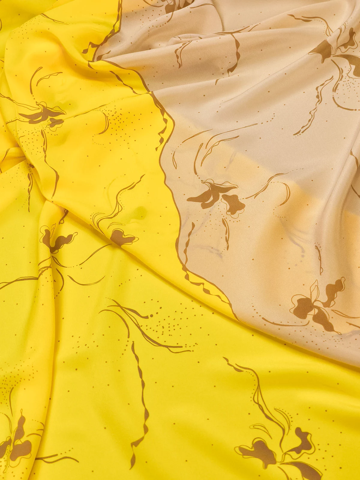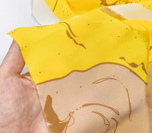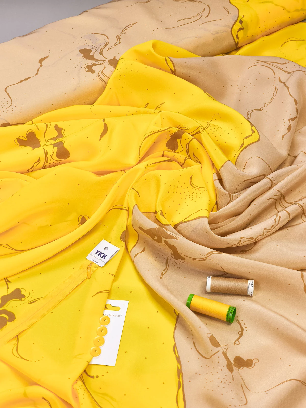 Принт нанесен очень оригинально вдоль кромок, разделяя ширину ткани примерно 2 к 3: светло-бежевая часть с розовой ноткой 50-55 см от кромки, желтая - 80-85 см.