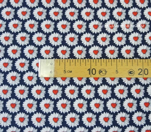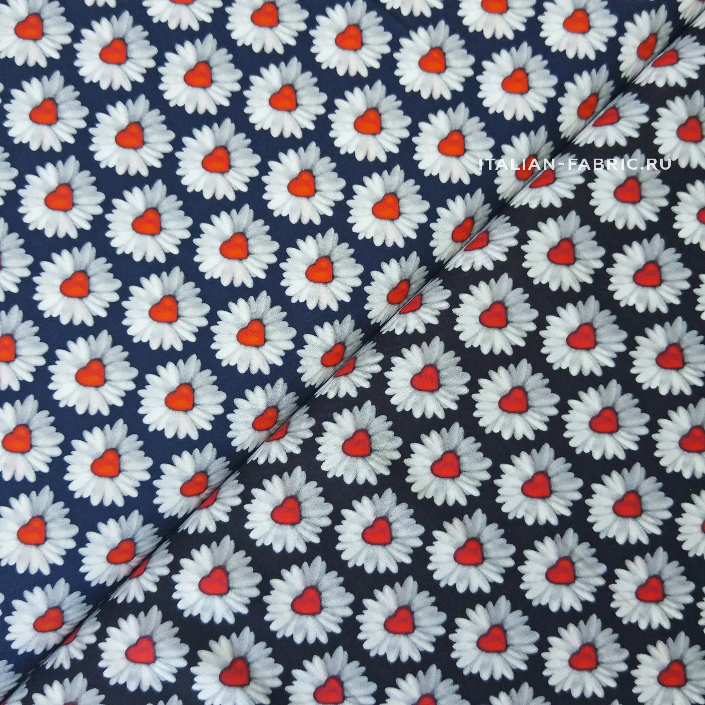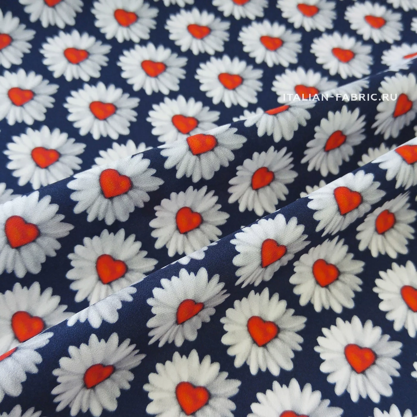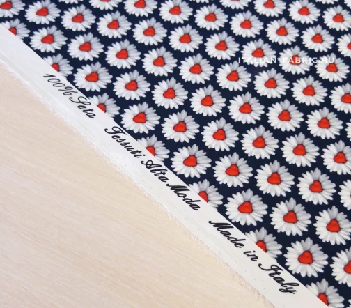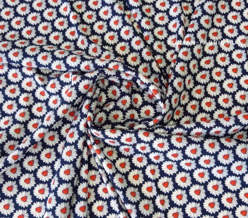 Дизайнерский принт на шелке с эластаном - белые ромашки с оригинальной сердцевинкой. Лицевая сторона матовая креповая, изнаночная - атласная, очень приятная к коже. Фон темно-синий.