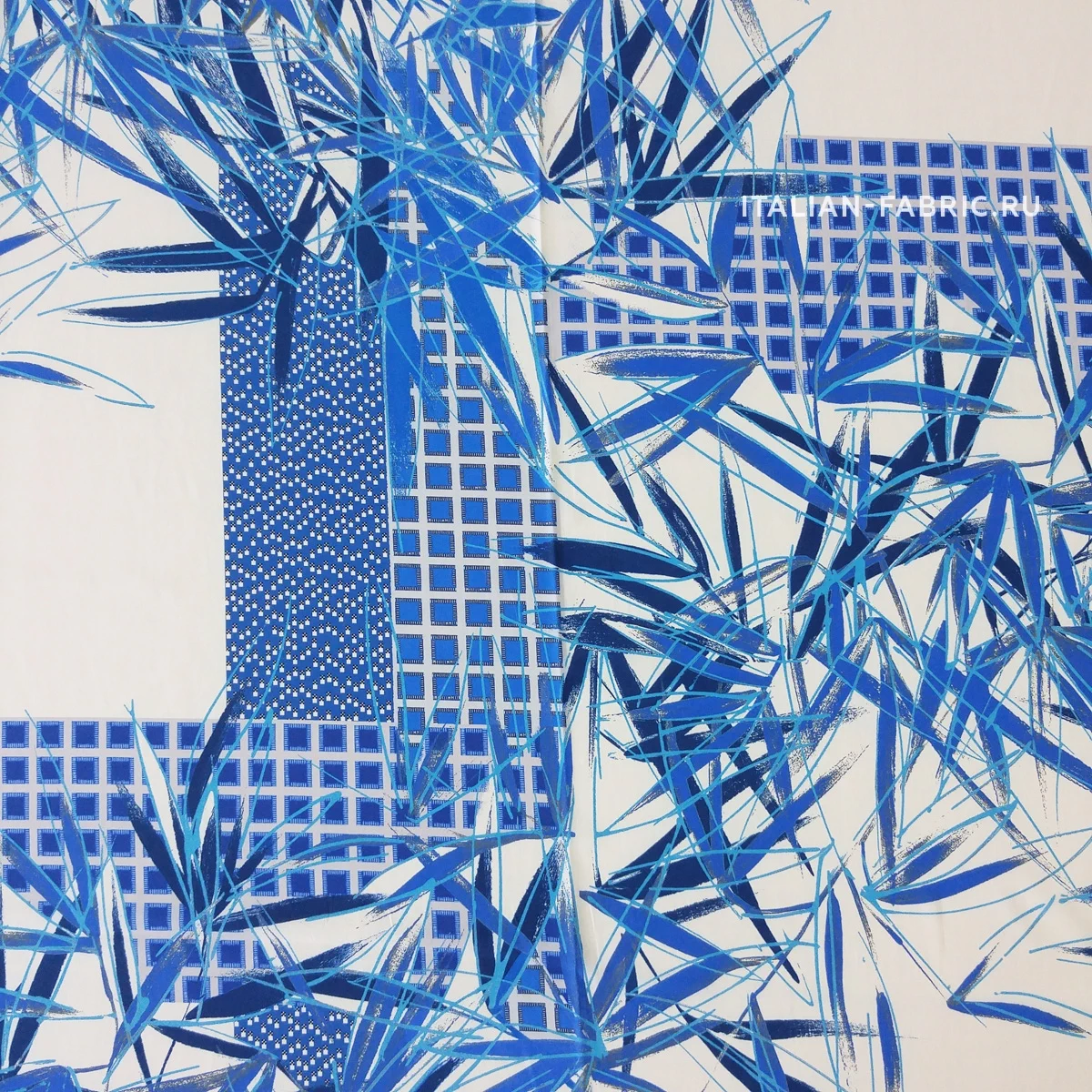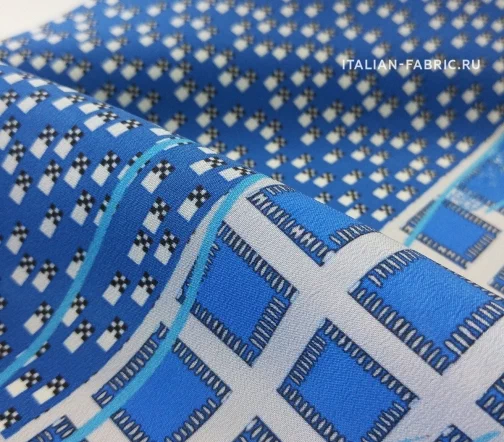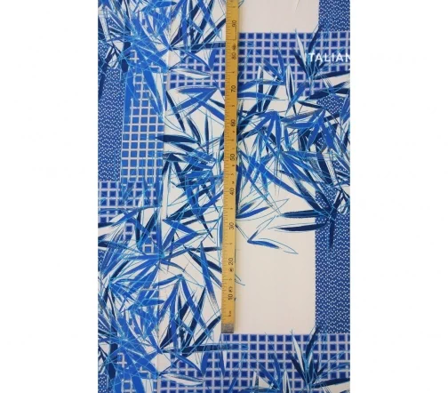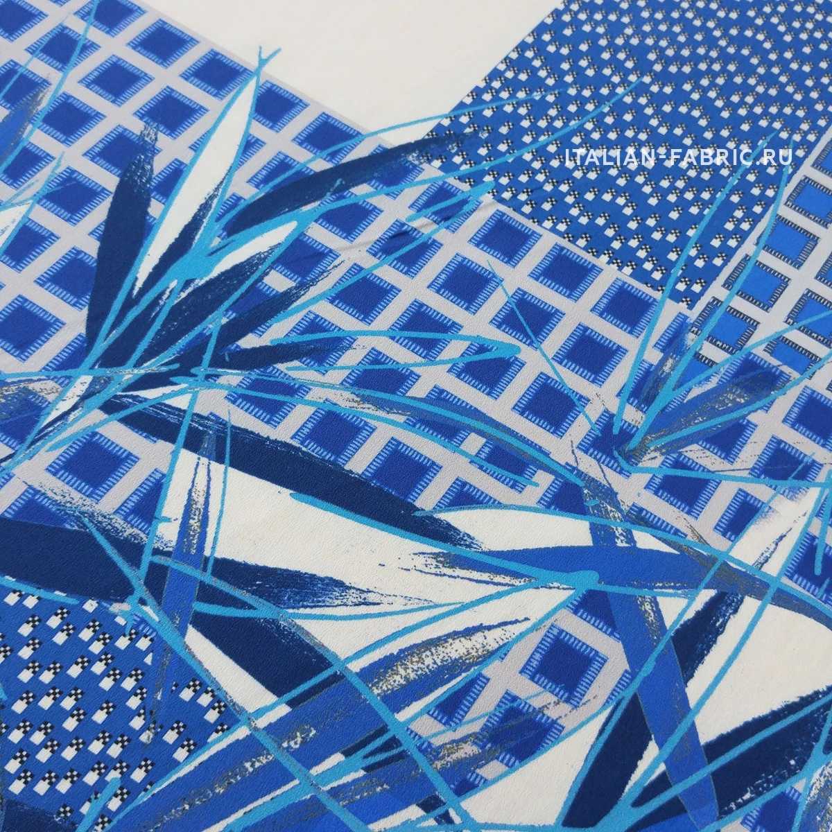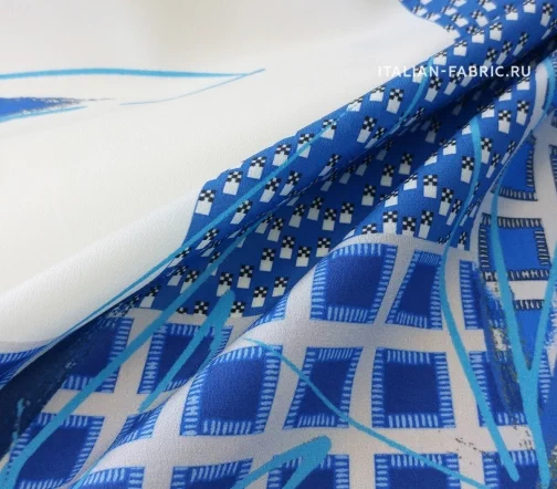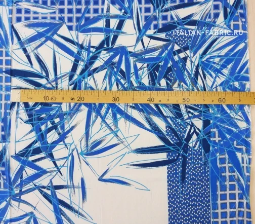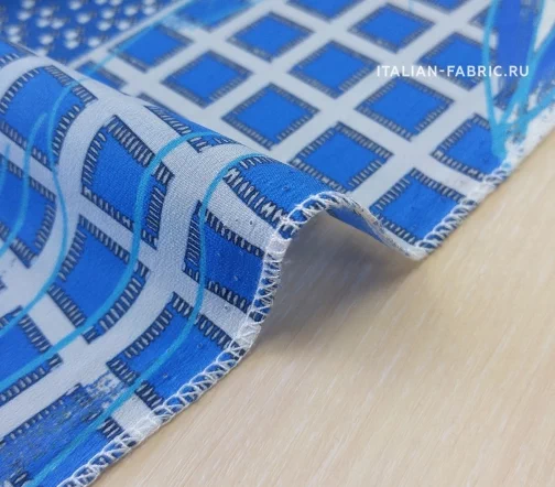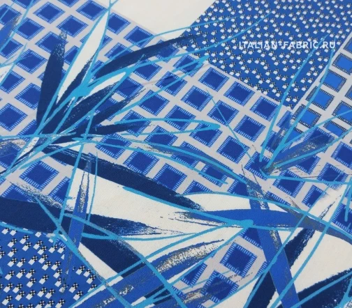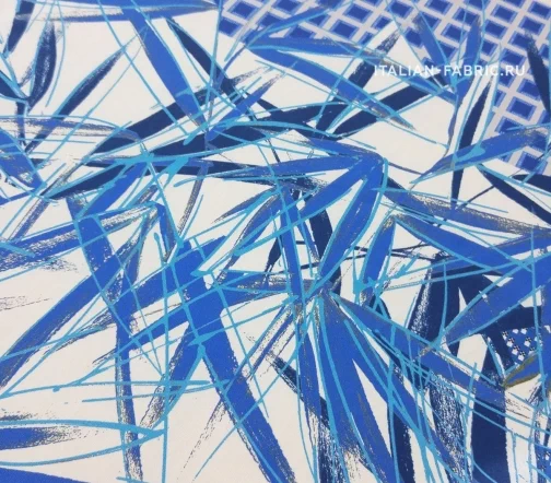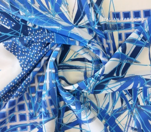 Принты, сочетающие несколько стилистически разных узоров не могут не вызывать восхищение! Такие материалы – это настоящее произведение искусства. 100 % шелк в синих оттенках принта, который объединил геометрический узор и листья.