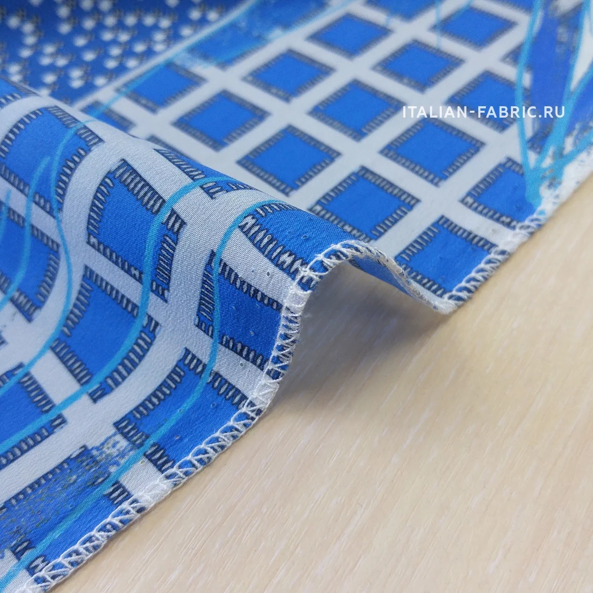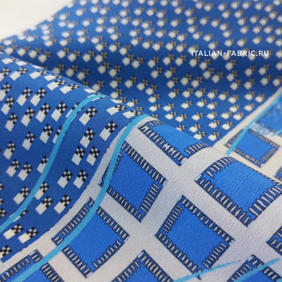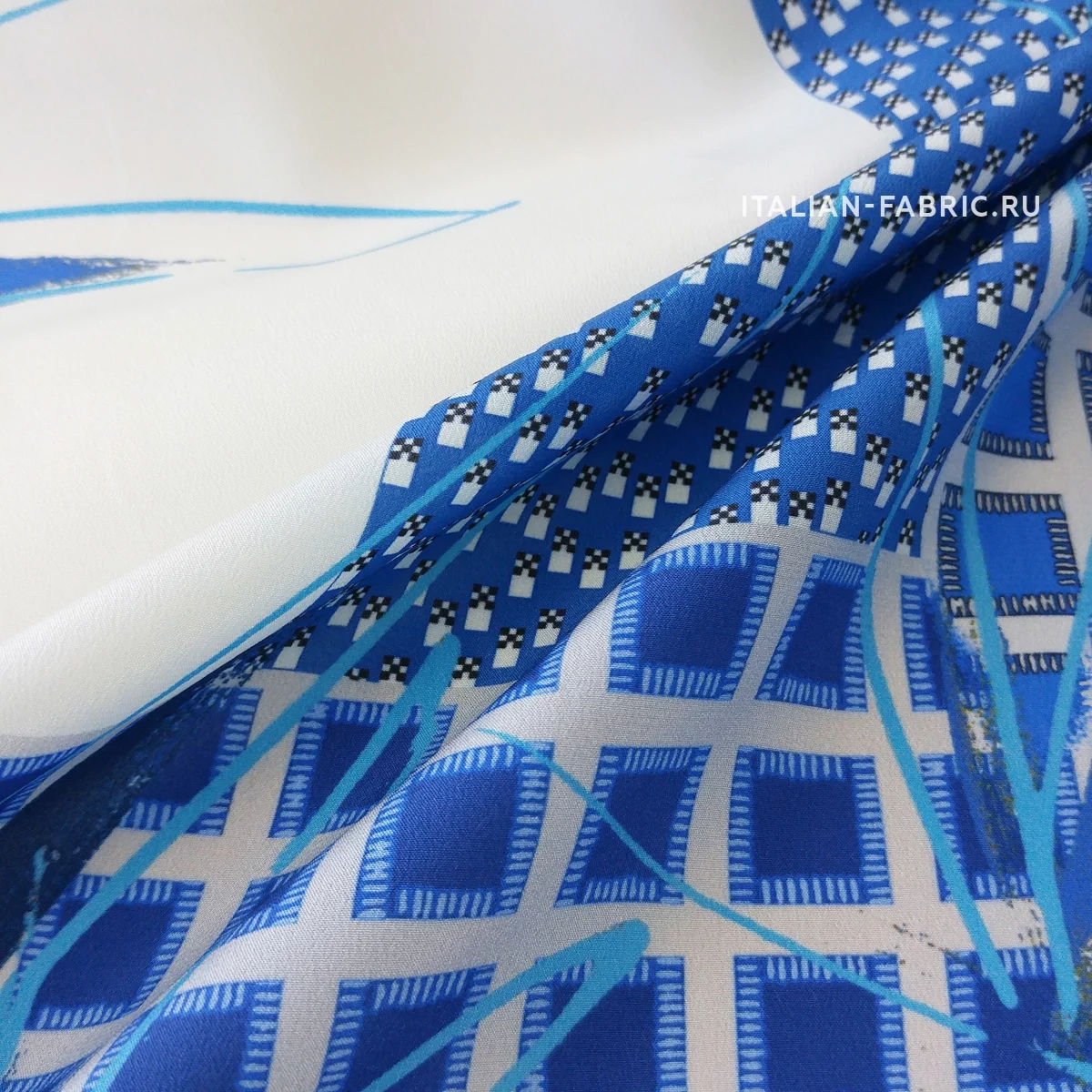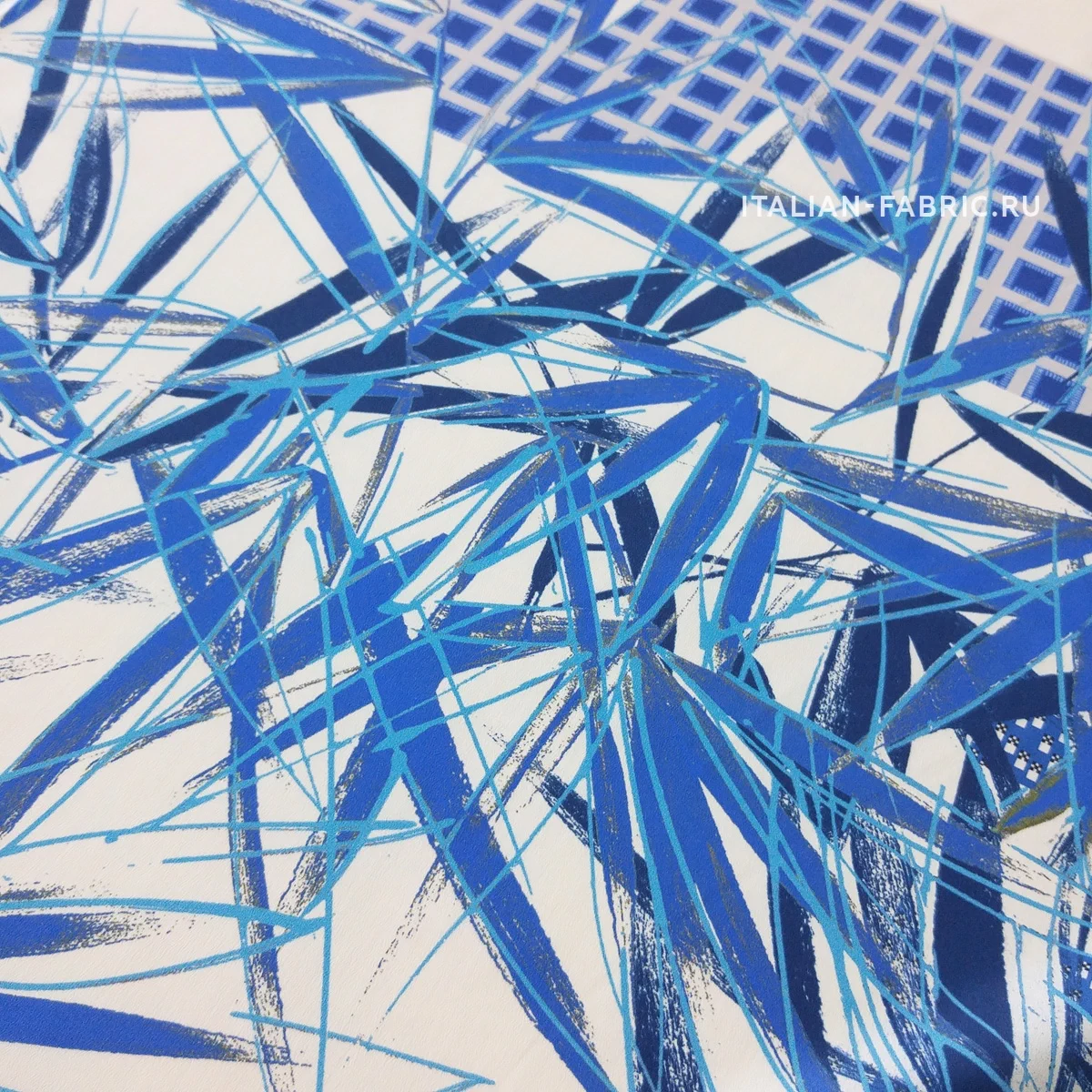 Принты, сочетающие несколько стилистически разных узоров не могут не вызывать восхищение! Такие материалы – это настоящее произведение искусства. 100 % шелк в синих оттенках принта, который объединил геометрический узор и листья.