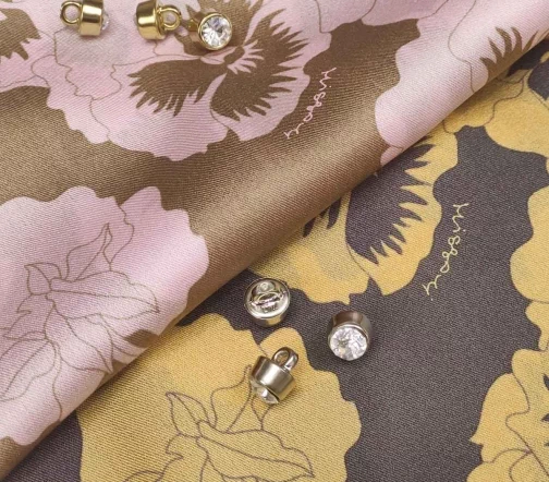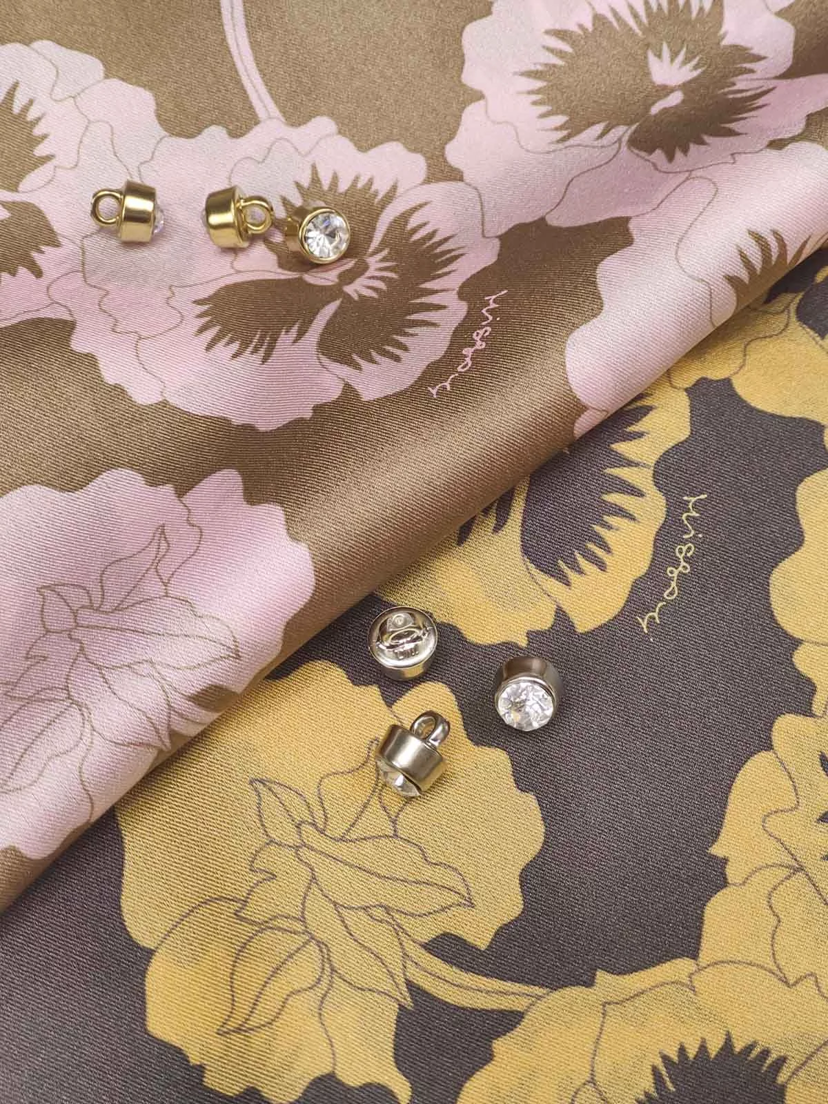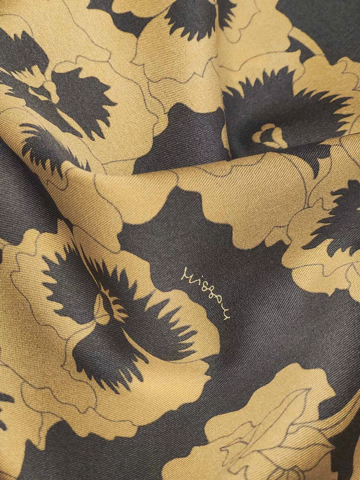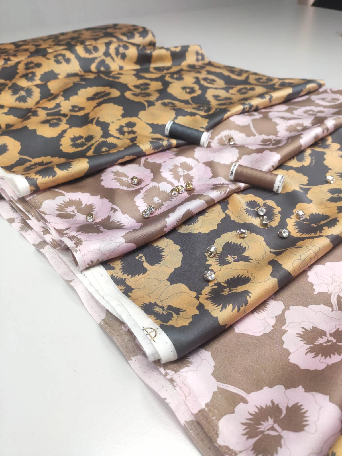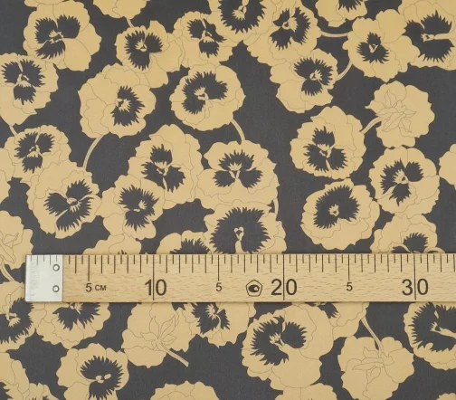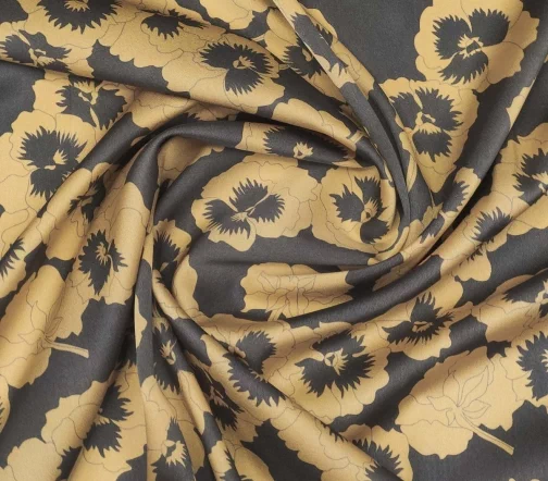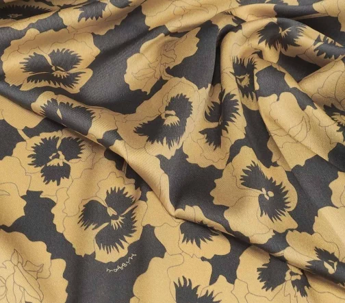 Безупречного качества плательно-блузочный шелк Missoni. Интересное цветовое сочетание темно-серого фона с нежными золотистыми бутонами анютиных глазок, хаотично разбросанных по полотну. Дополняют дизайнерский принт редкие подписи оригинального логотипа бренда.