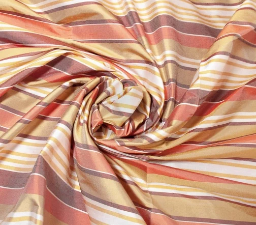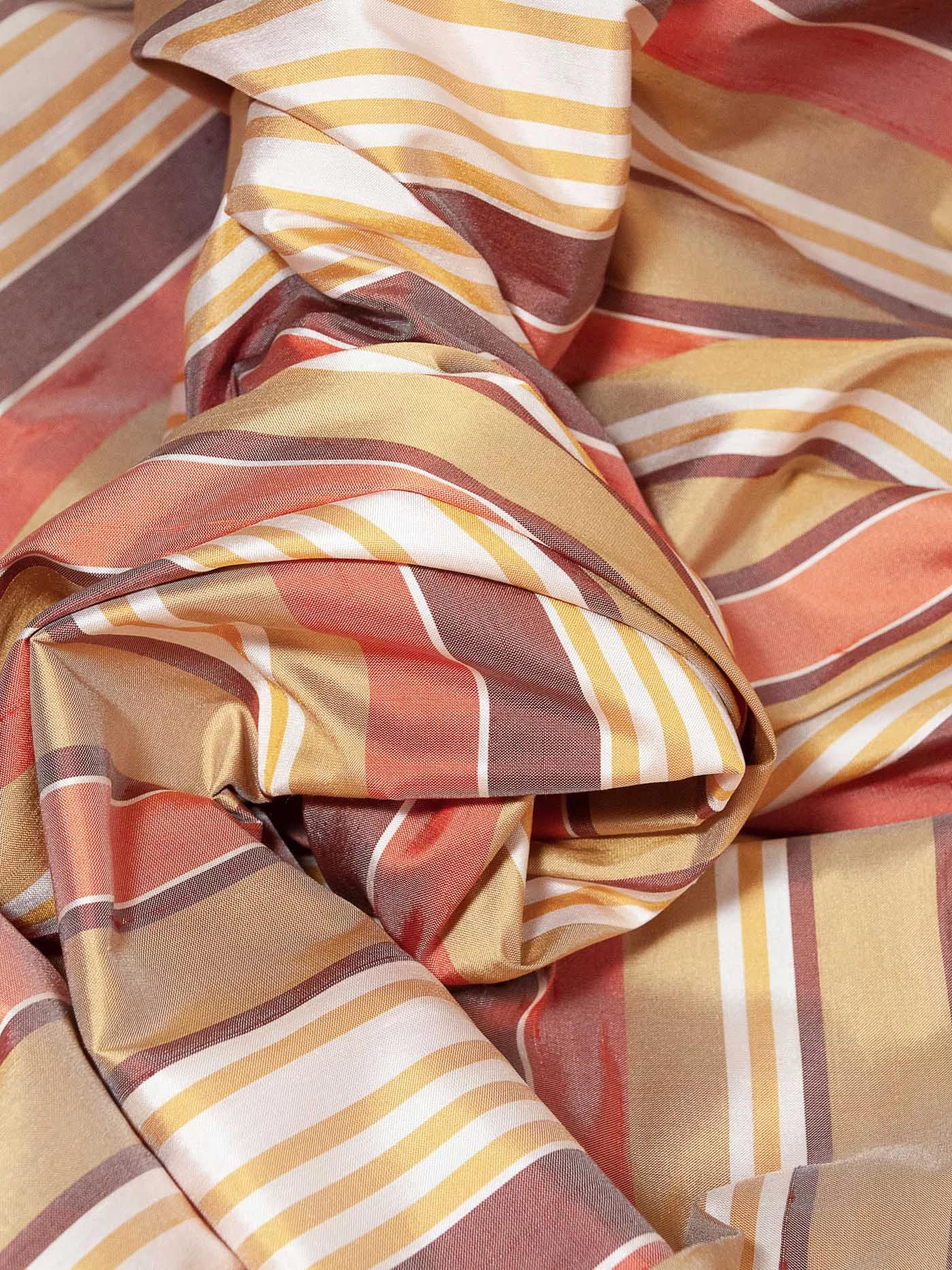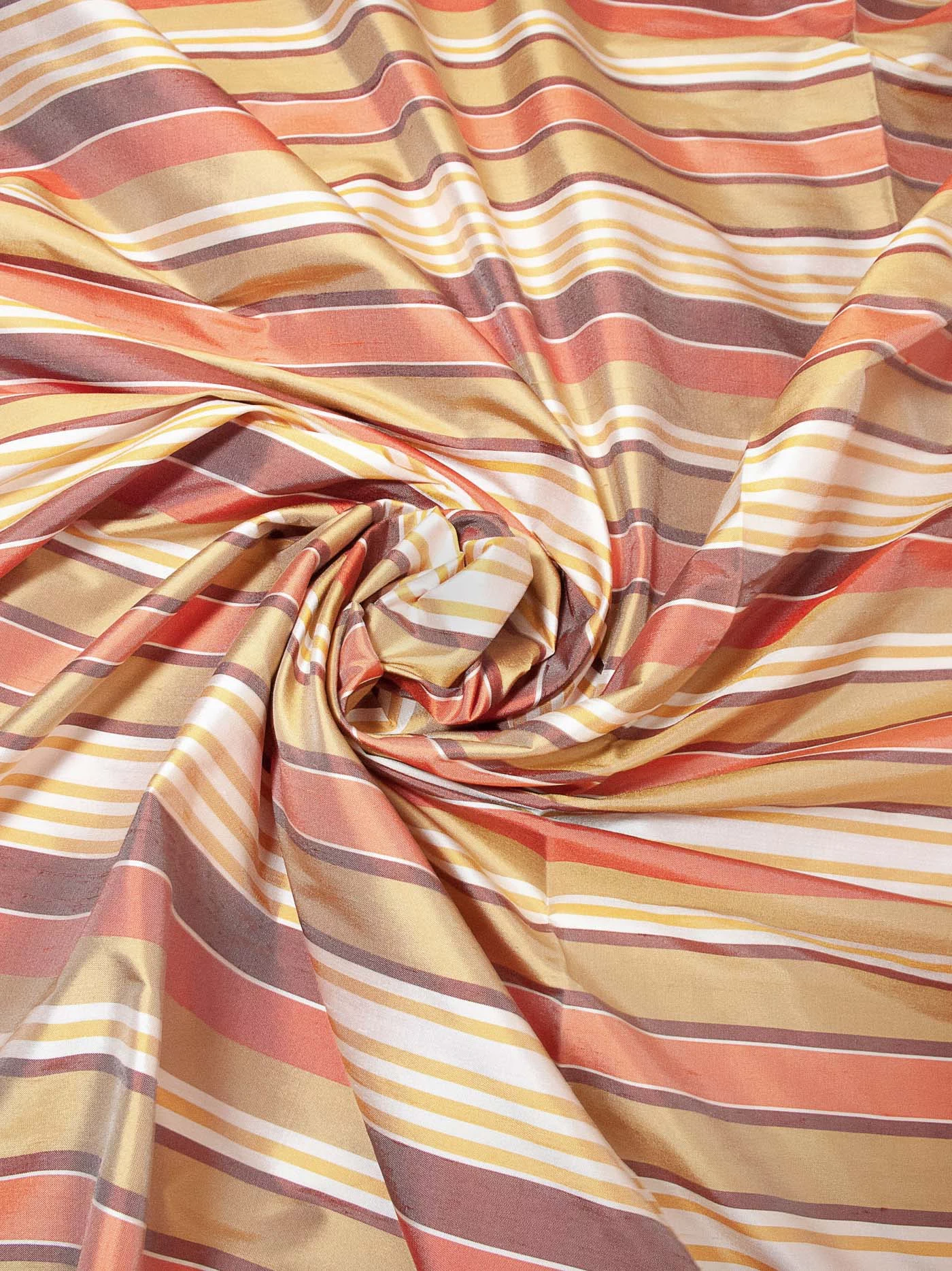 Полосы расположены перпендикулярно кромке. Сочетание кораллового, горчицы, рыже-коричневого и молочного цветов.