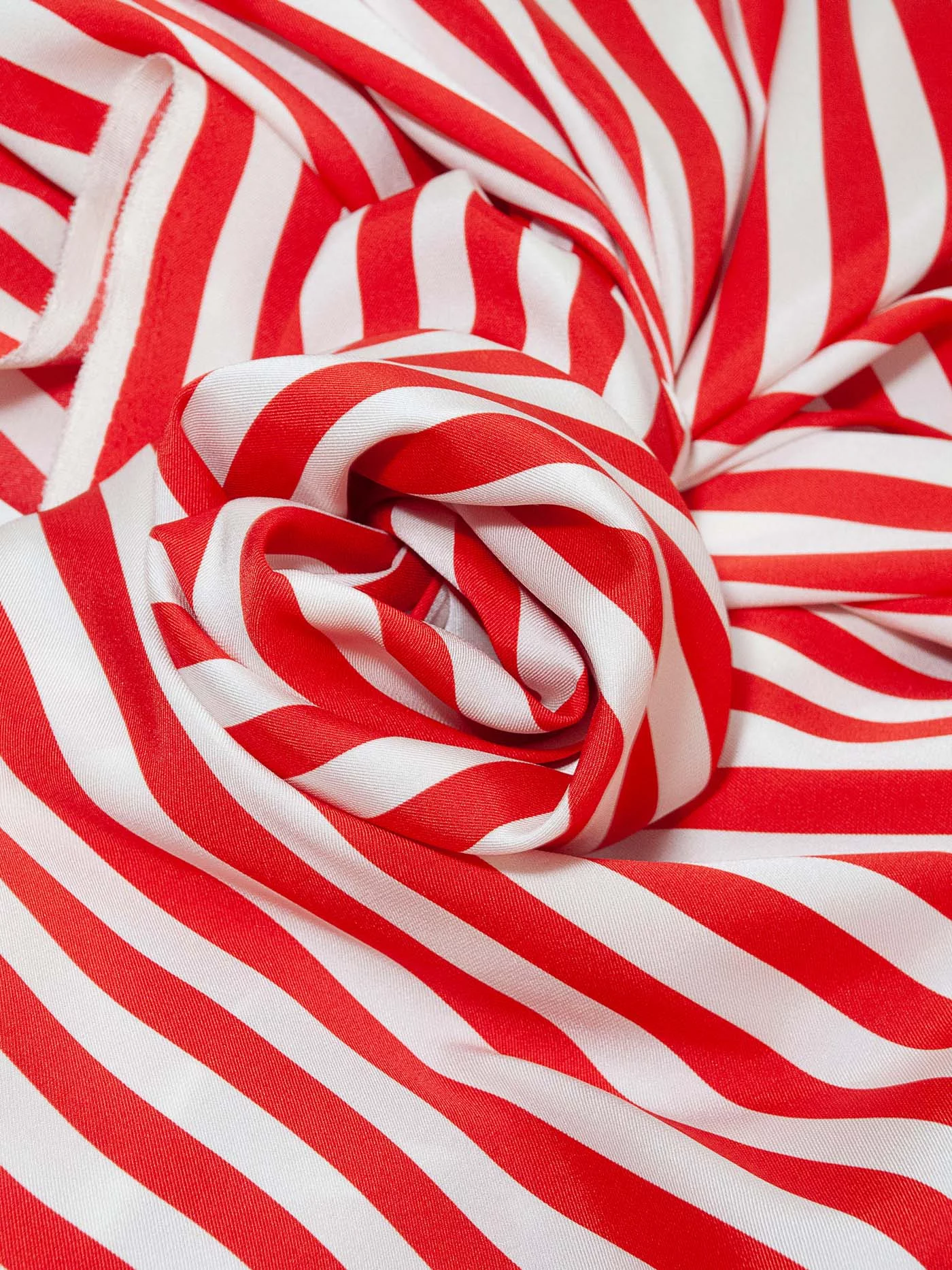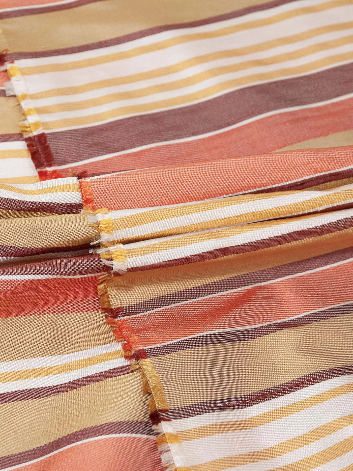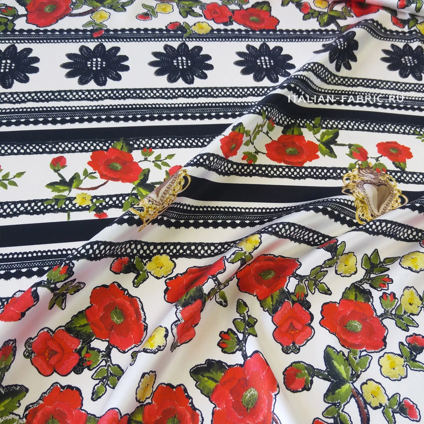Фон молочный. Ширина полоски 1,2 см. Полоска расположена вдоль кромки. Не просвечивает. Шелк с выработкой в рубчик. Средней плотности. Прекрасно подходит для пошива платья-рубашек и любых других летних изделий.