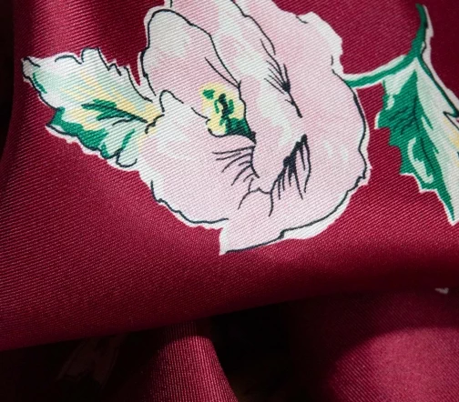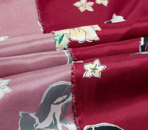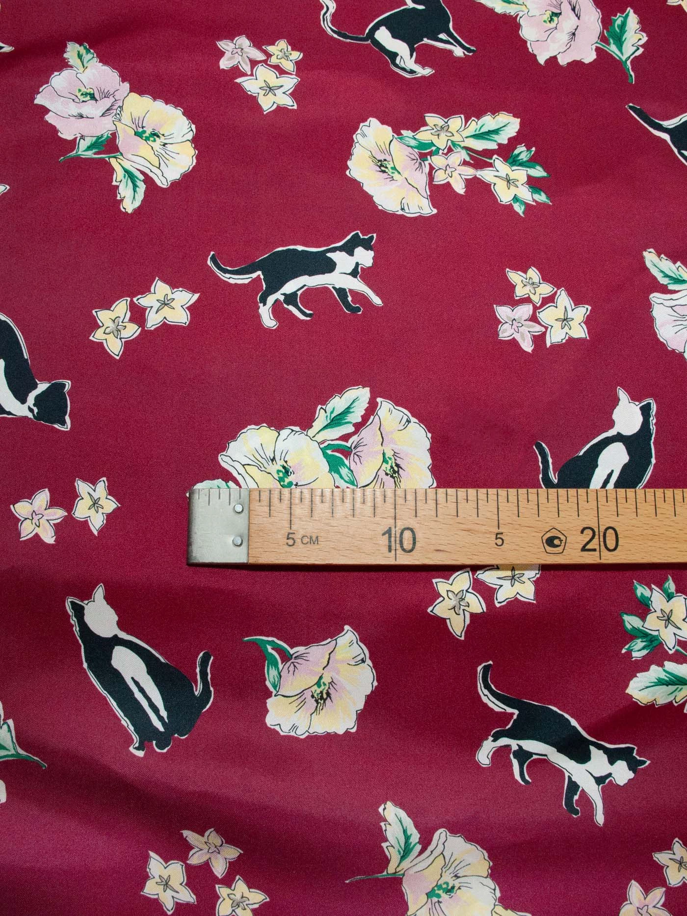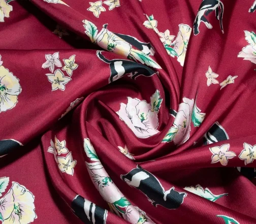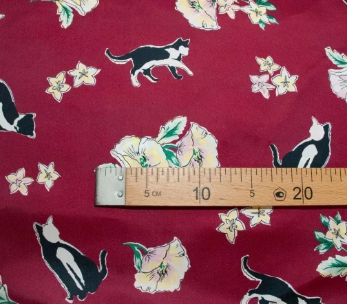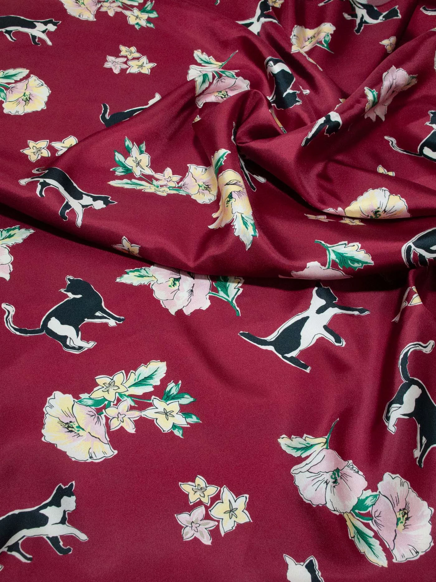 Шелковая ткань с игривыми черно-белыми кисками и розово-желтыми бутонами стилизованных графичных цветов на изящном бордовом фоне. Материал тонкий, но достаточно прочный, не просвечивает, с характерным для твила плетением и красивым блеском. Драпируется мягкими объемными фалдами - лучше всего подходит для создания платья или блузы.