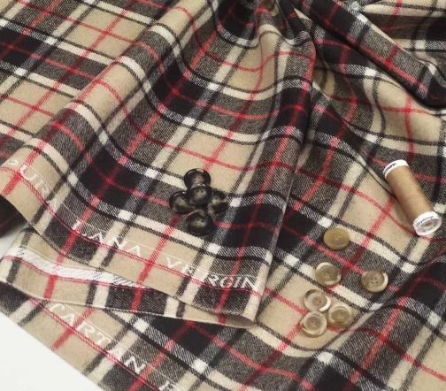 Ткань в клетку, выполненная чистой виргинской шерсти (pura lana vergine) из коллекции Tartan Esclusive в стиле Burberry. Костюмная группа.