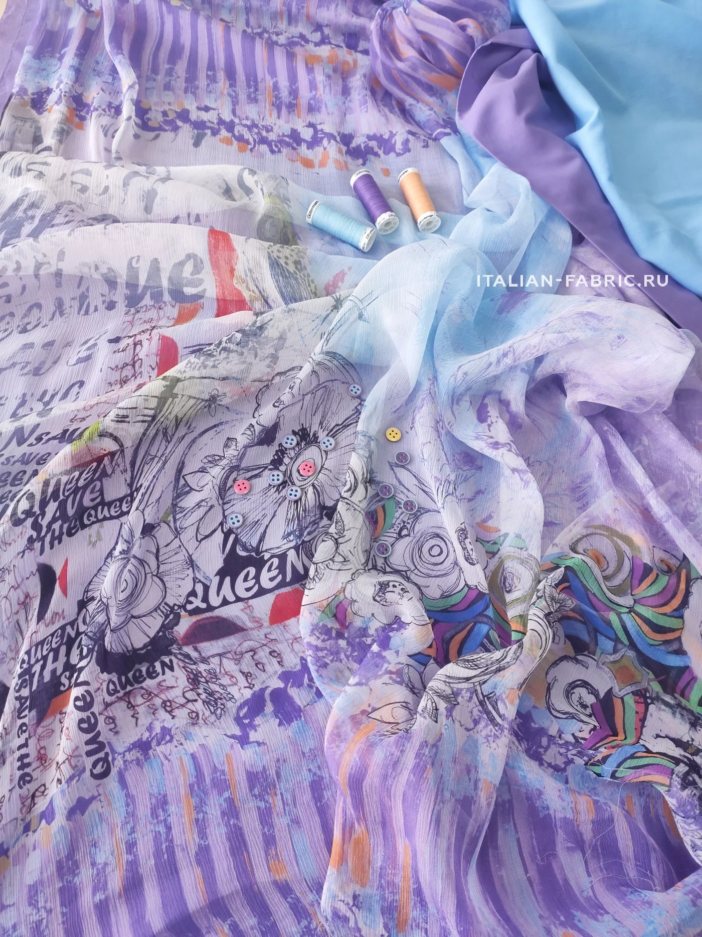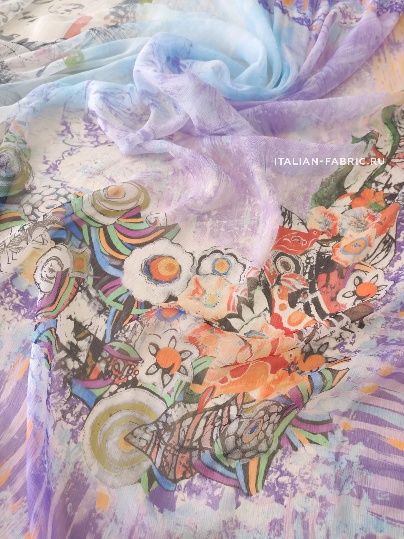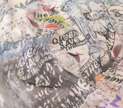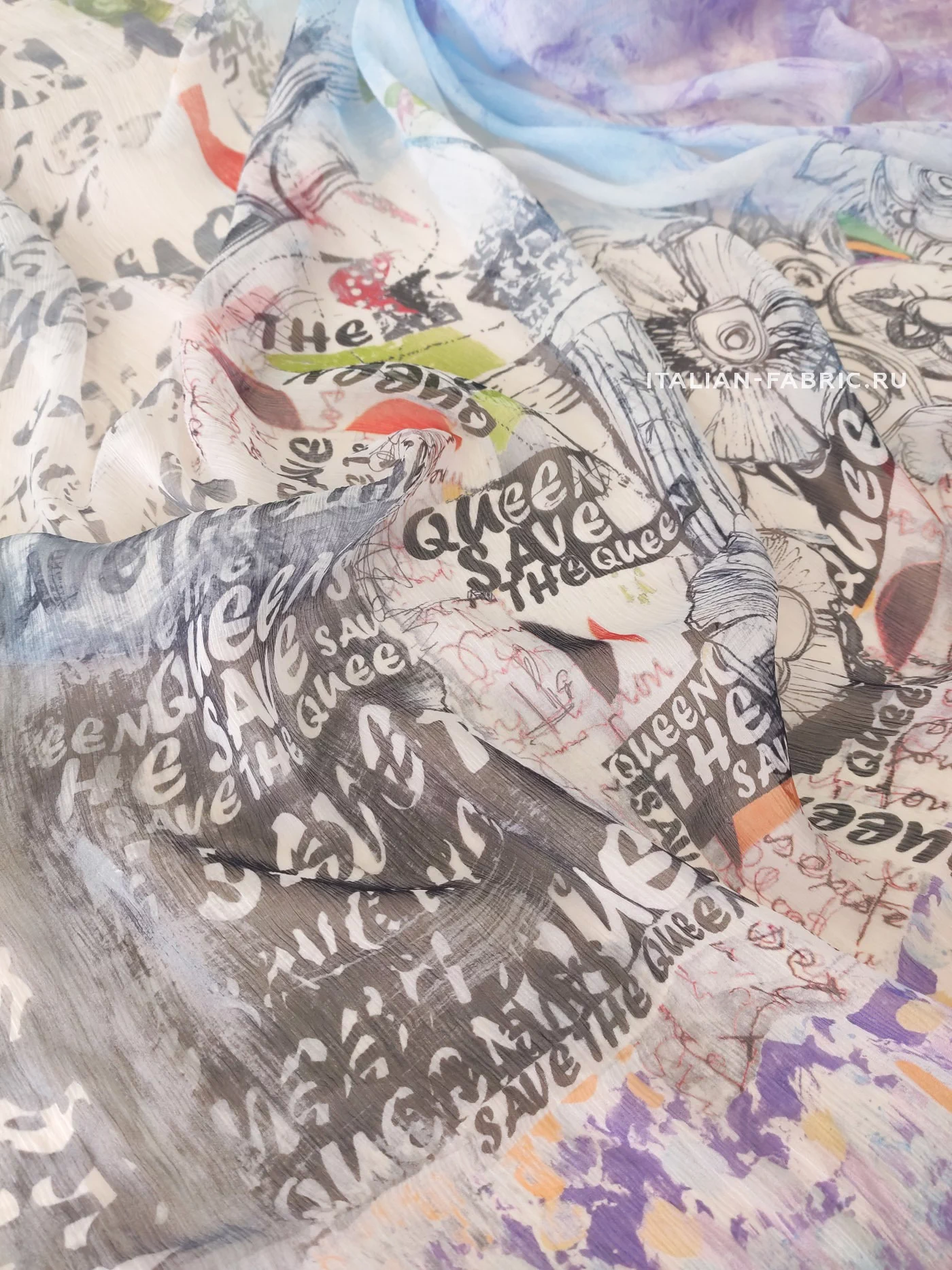 Эксклюзивный подписной шифон Save the Queen. Шелковый материал с оригинальной художественной эстетикой, свойственной итальянскому бренду. Полотно с цветами и птицами в стилистике картин постимпрессионизма богато красками и деталями. Графичные цветы и крупный часто повторяющийся логотип Save the Queen, будто написанные чернилами, придают стильный акцент материалу. Крешированная фактура шифона подчеркивает аутентичный рисунок полотна.