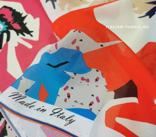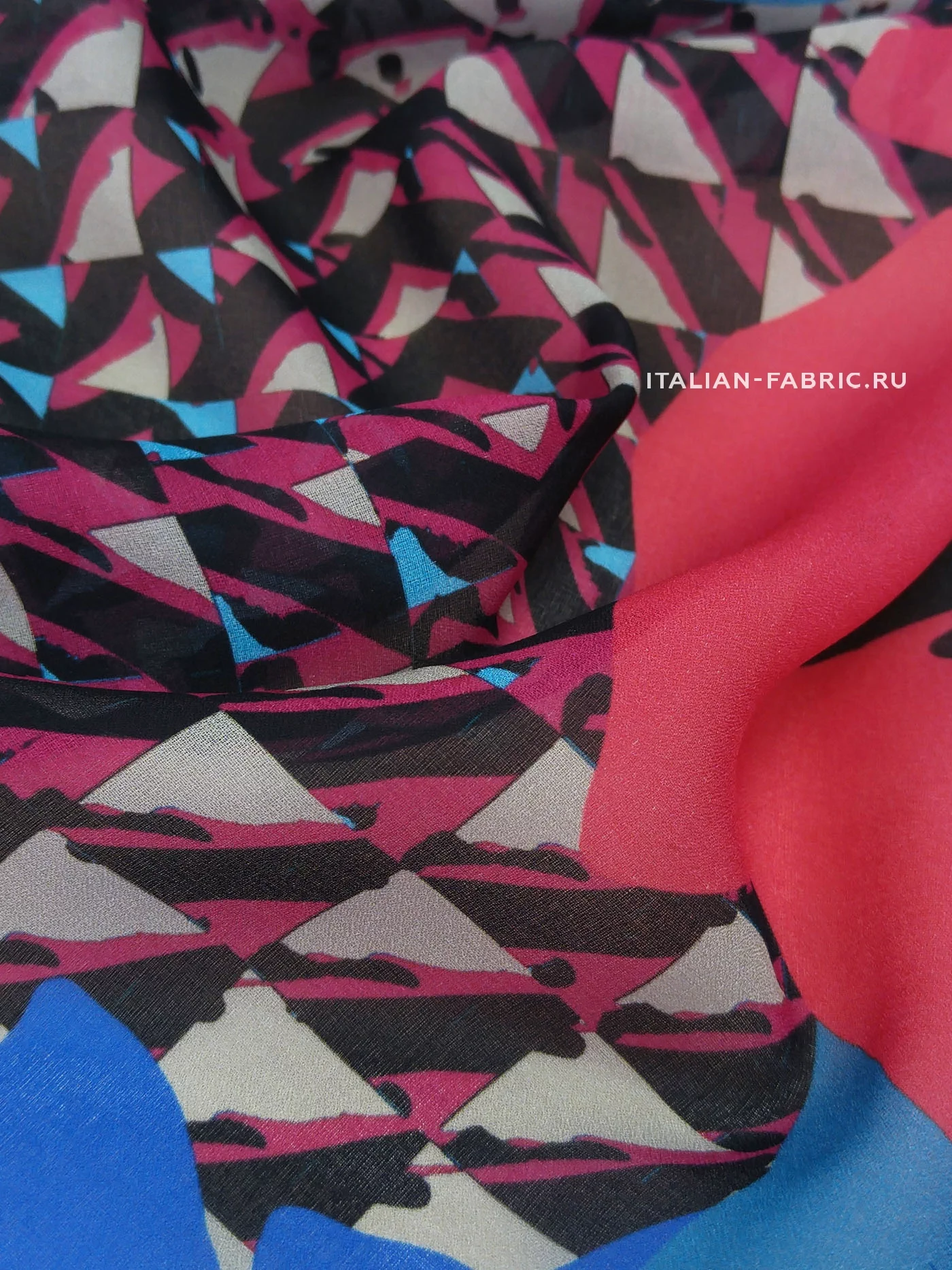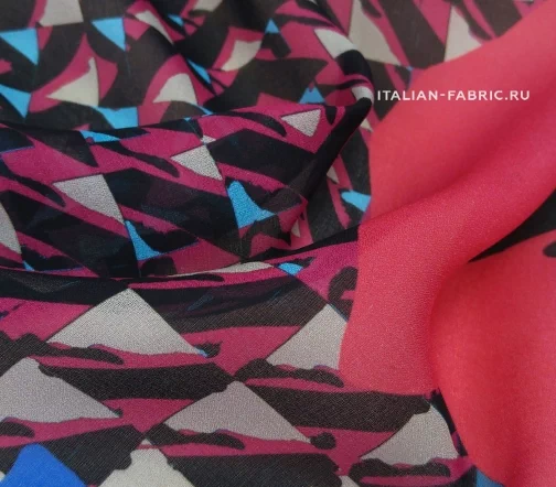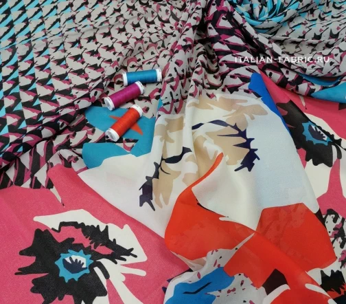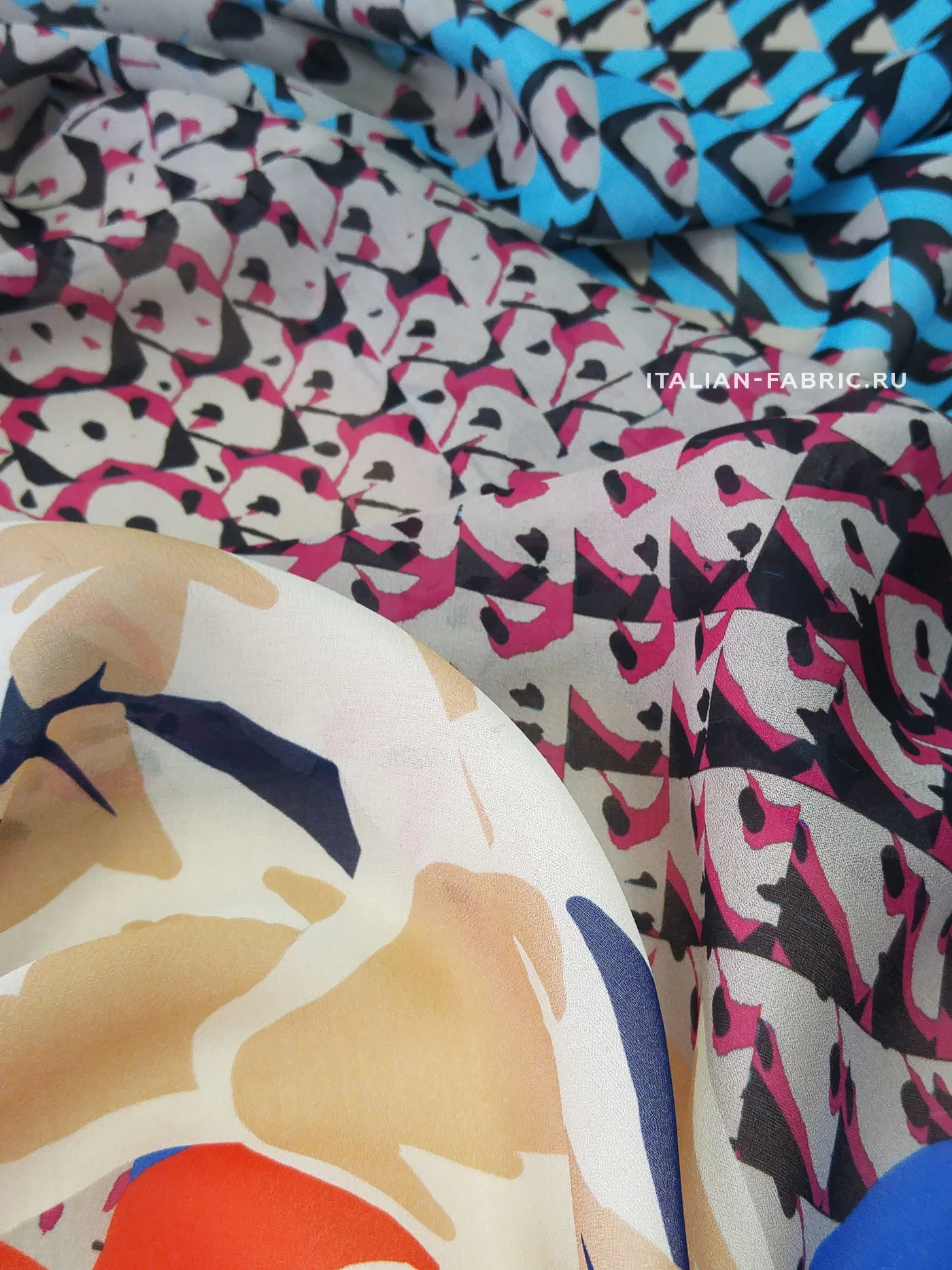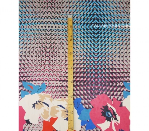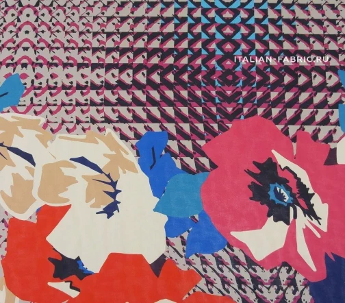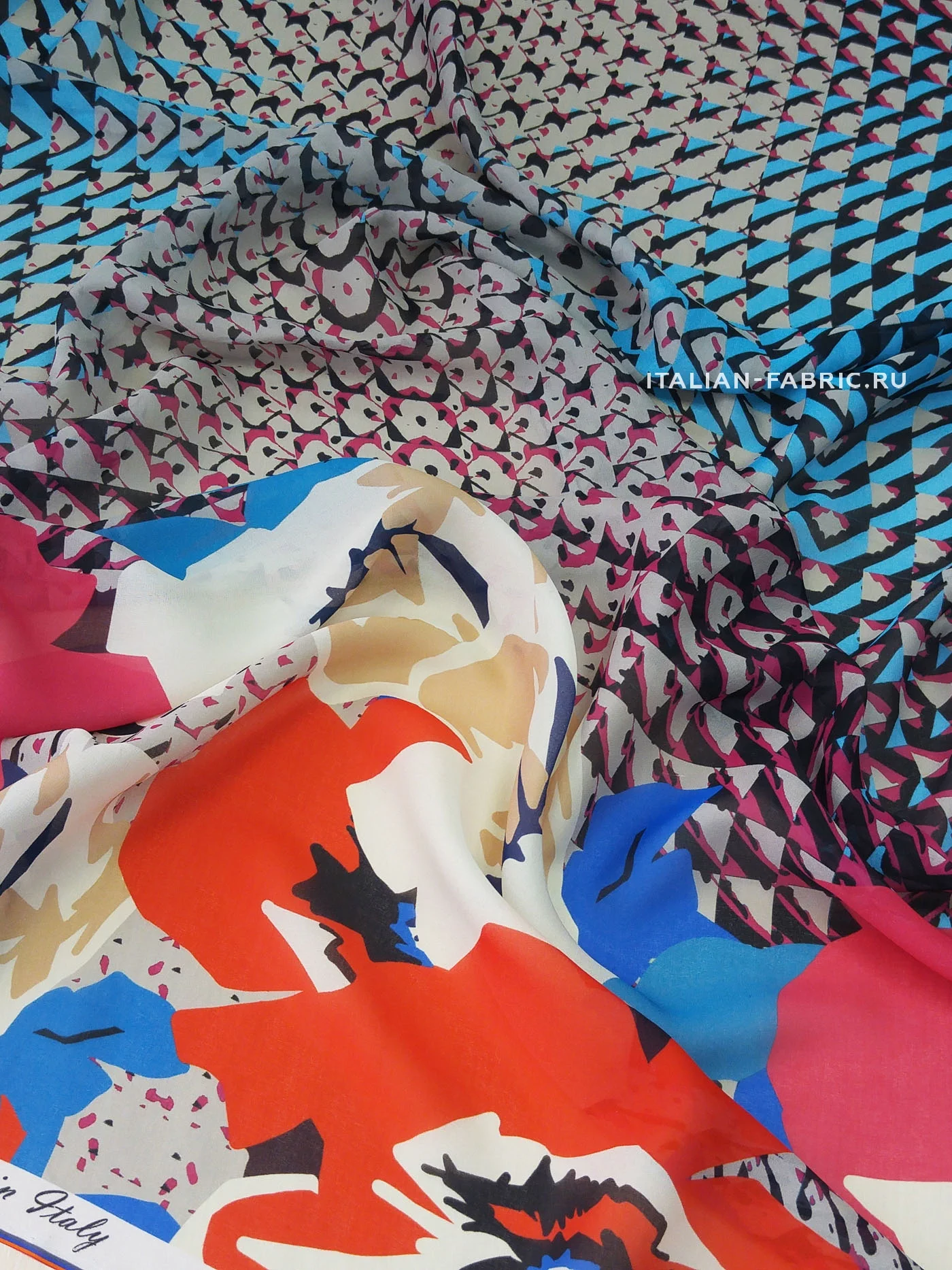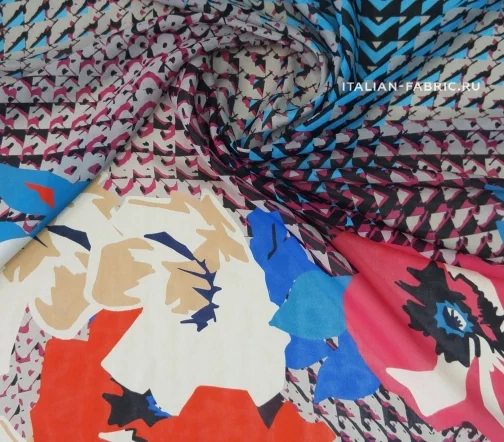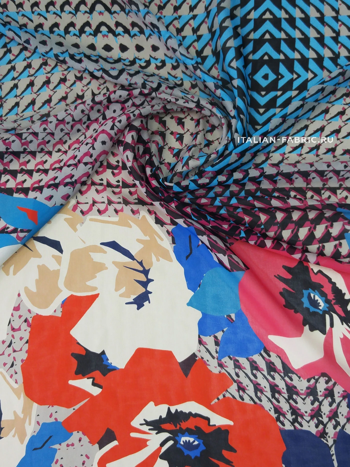 Бесподобный шифон из 100% шелка с уникальным принтом – крупными графичными цветами по одной кайме и геометрическим узором, напоминающим орнамент, созданный калейдоскопом. Материал будет шикарно смотреться в удлиненных изделиях – платьях, платьях-рубашках, длинных блузках, юбках. Изделие из этого шифона подчеркнет вашу индивидуальность и стиль.