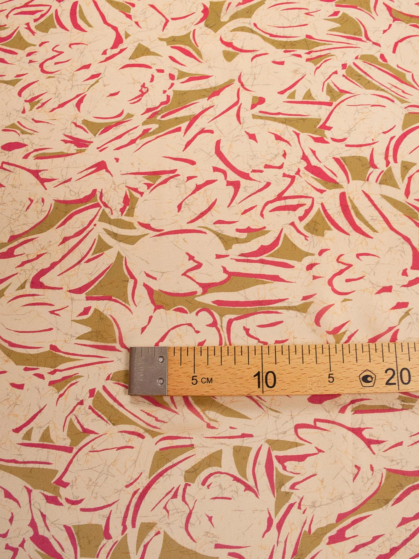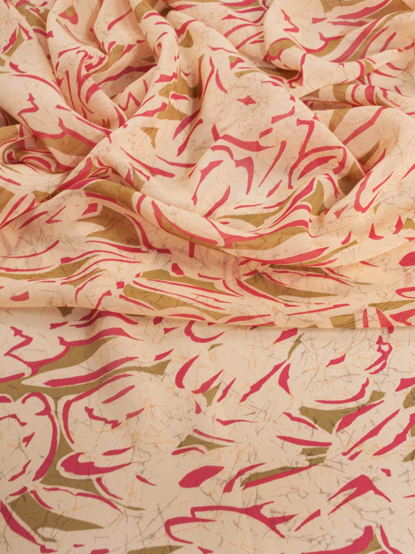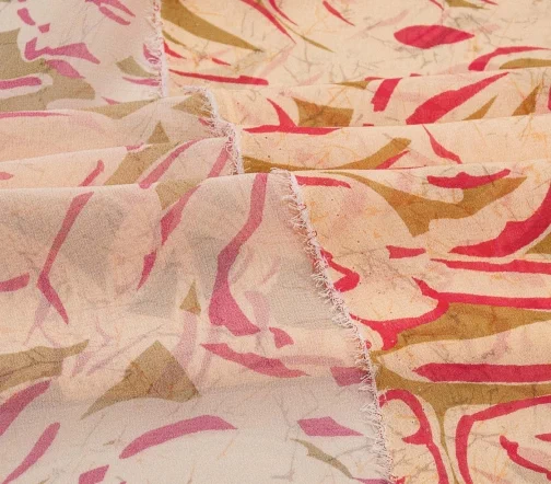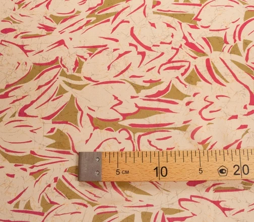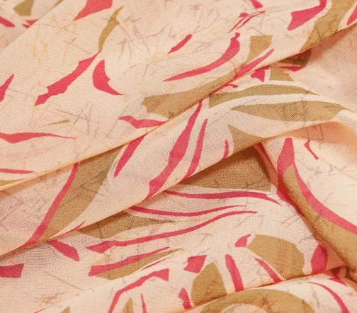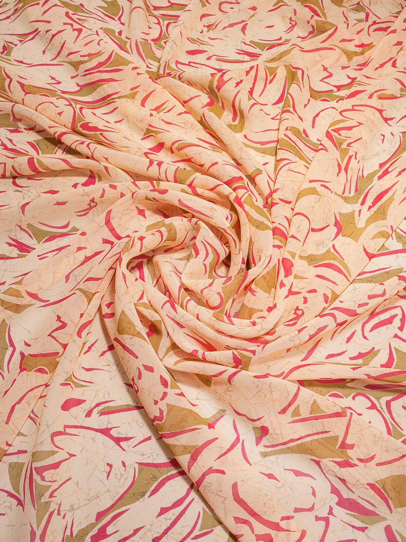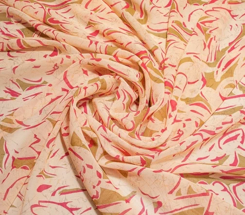Воздушный шелковый шифон со стилизованным цветочным узором оригинального сочетания оливкового цвета и фуксии на нежном розово-бежевом фоне. Подойдёт для топов, блузок, платьев и юбок свободных фасонов. Просвечивает.