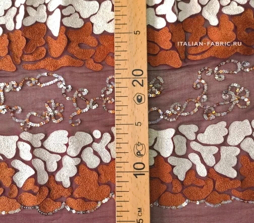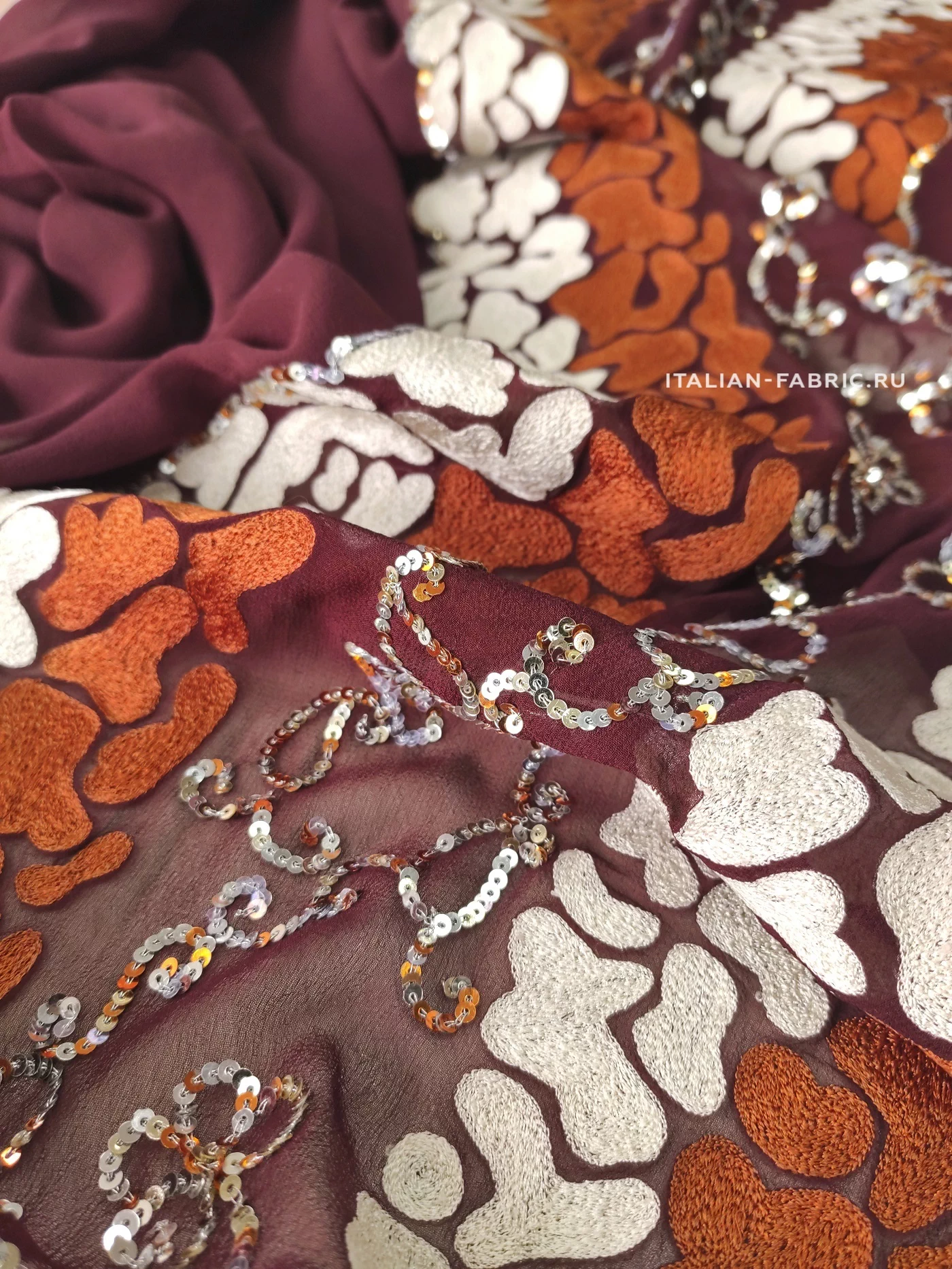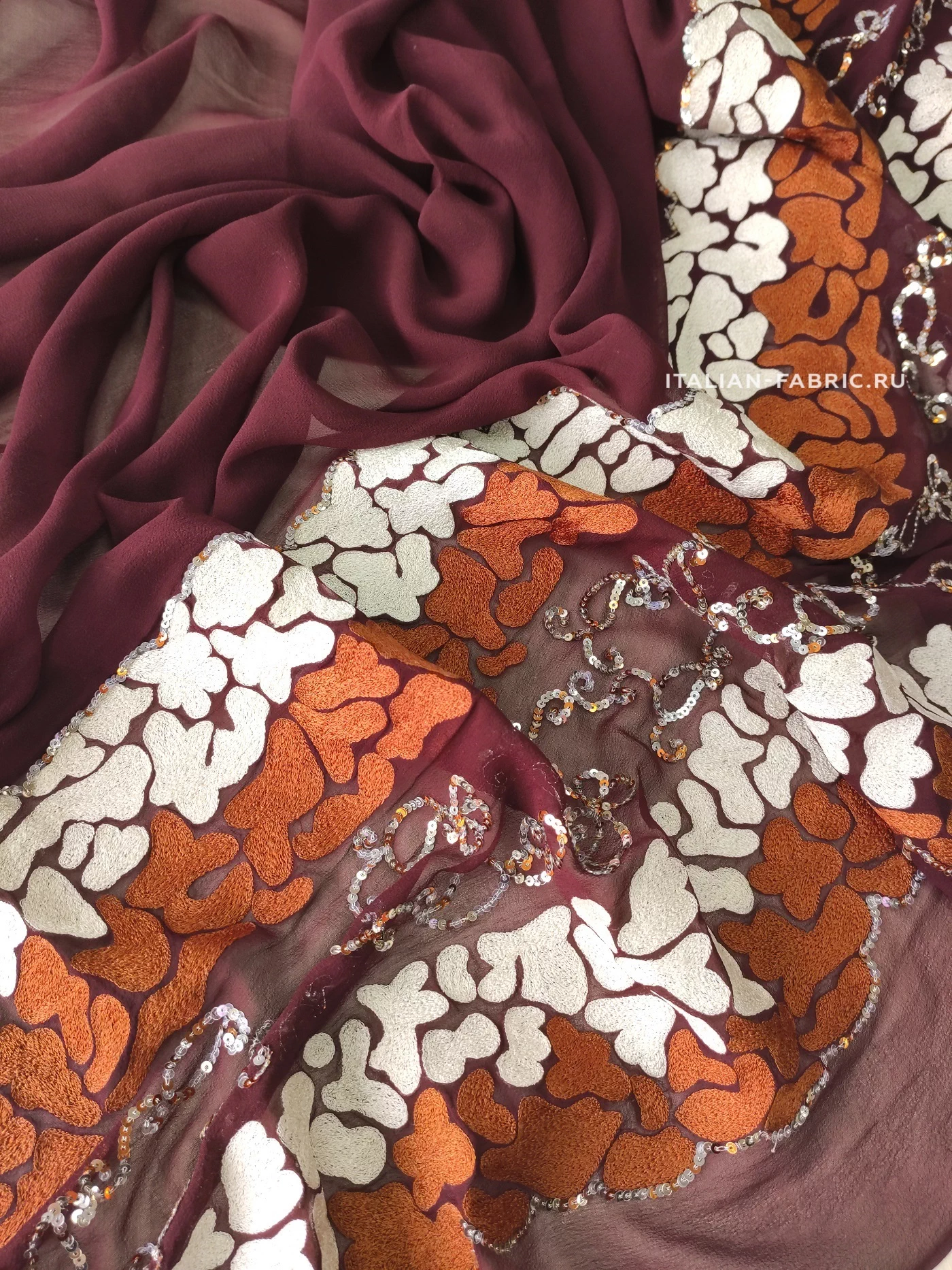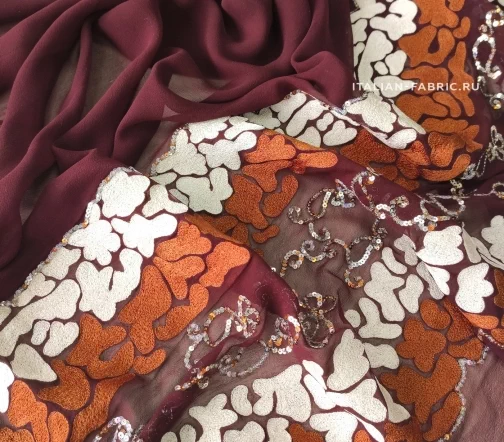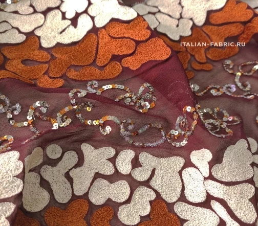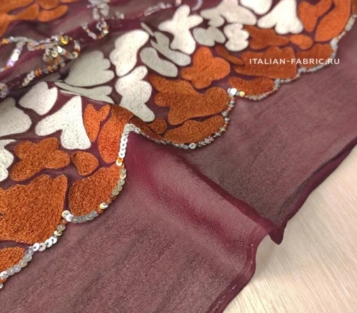 Роскошный шифон с вышивкой и пайетками. Этот материал по-восточному богат и прекрасен! На воздушном шелковом шифоне изумительного бордового оттенка эффектно выделяется плотная вышивка молочного и терракотового цветов в причудливой обтекаемой форме в дуэте с орнаментом из пайеток. Кайма 30 см в высоту. Изделие из этого материала будет неподражаемо красивое и эффектное!