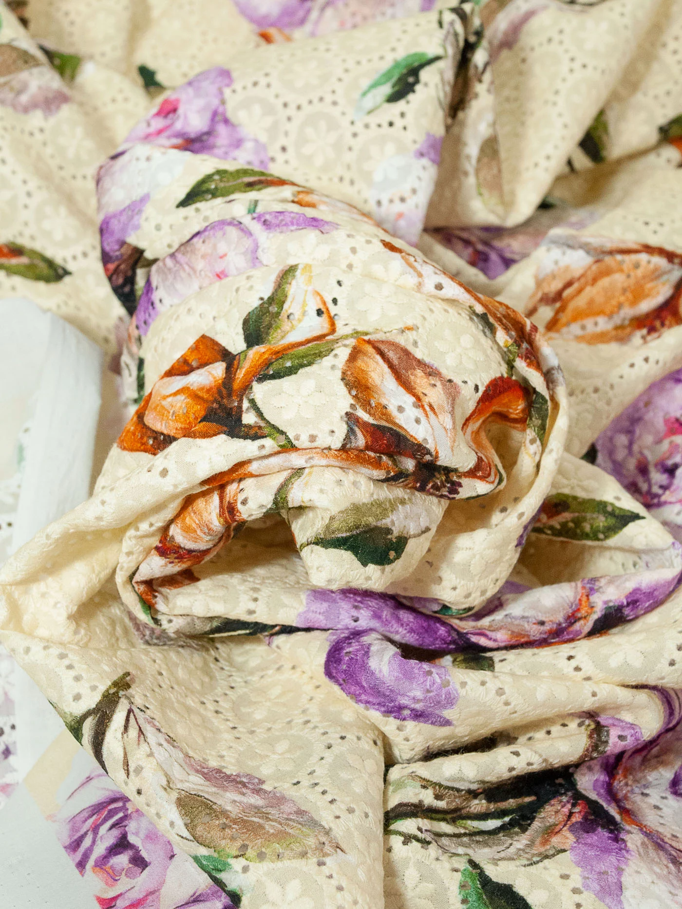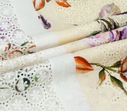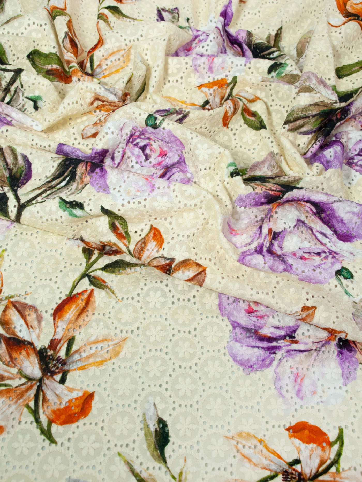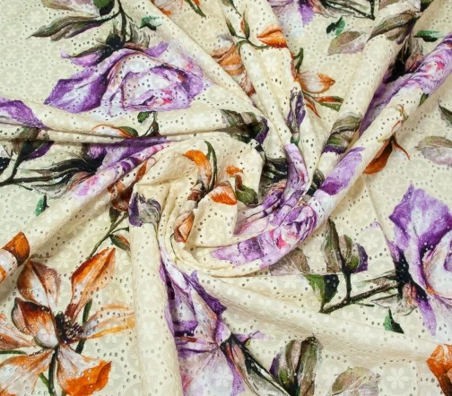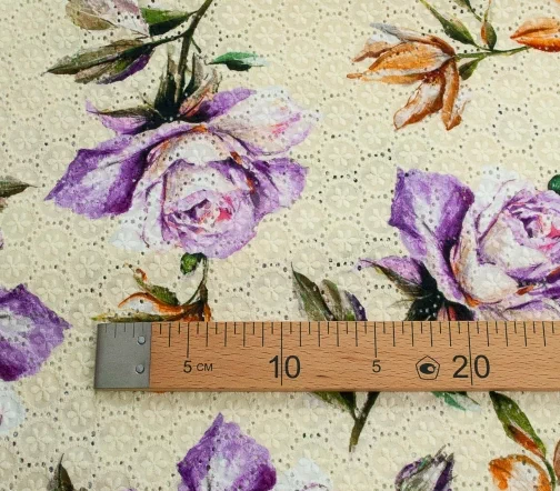 Красивый, яркий, эффектный, по-настоящему летний материал. Элемент вышивки – 3 х 3 см в форме круга, с аккуратным маленьким цветком в центре. Плотность средняя, тактильно обворожительно приятное шитье. Для пошива любых летних изделий. Основной фон нежно лимонный.