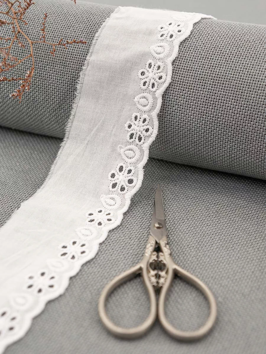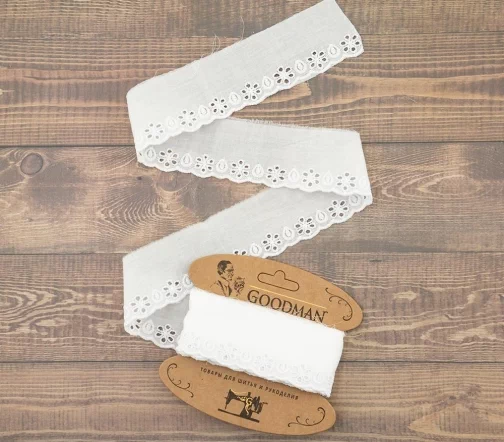 Шитье выполнено хлопчатобумажными нитями № 40 на батисте, сфера применения: отделка домашней, детской и женской одежды, столового и постельного белья. Также используется как элемент декора различных рукодельных текстильных проектов.