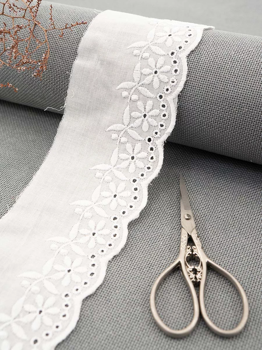 Шитье выполнено хлопчатобумажными нитями № 40 на батисте, сфера применения: отделка домашней, детской и женской одежды, столового и постельного белья. Также используется как элемент декора различных рукодельных текстильных проектов.