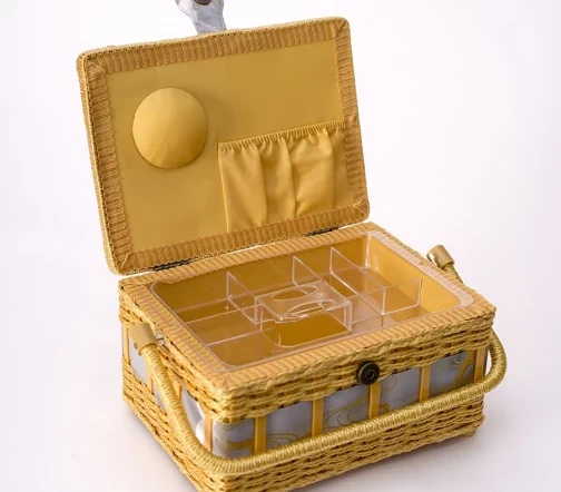 Шкатулка для рукоделия – незаменимый предмет для любой рукодельницы! В ней не только удобно хранить швейные принадлежности и аксессуары, такая шкатулка также станет прекрасным украшением интерьера! А еще это отличная идея для подарка тем, кто увлекается шитьем, вышиванием и другими видами рукоделия. Шкатулка обтянута тканью из 100% хлопка, имеет плетеную ручку для переноски и оплетку по периметру крышки. Внутри шкатулки на крышке закреплена подушечка для хранения игл, а также имеется внутренний контейнер из пластика с отделениями для хранения мелких аксессуаров.