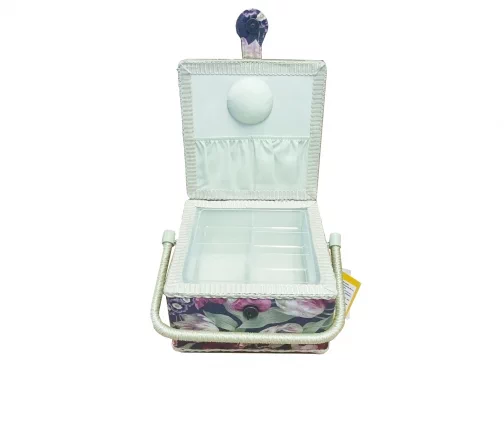 Шкатулка для рукоделия – незаменимый предмет для любой рукодельницы! В ней не только удобно хранить швейные принадлежности и аксессуары, такая шкатулка также станет прекрасным украшением интерьера! А еще это отличная идея для подарка тем, кто увлекается шитьем, вышиванием и другими видами рукоделия. Шкатулка обтянута тканью из 100% хлопка, имеет плетеную ручку для переноски и оплетку по периметру крышки. Внутри шкатулки на крышке закреплена подушечка для хранения игл, а также имеется внутренний контейнер из пластика с отделениями для хранения мелких аксессуаров.