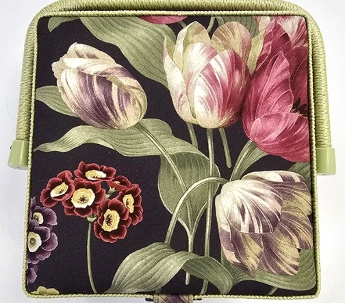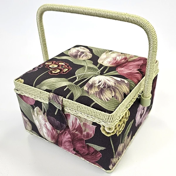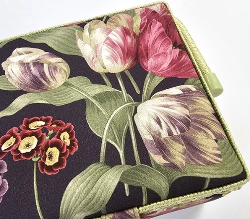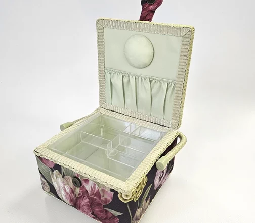 Шкатулка для рукоделия – незаменимый предмет для любой рукодельницы! В ней не только удобно хранить швейные принадлежности и аксессуары, такая шкатулка также станет прекрасным украшением интерьера! А еще это отличная идея для подарка тем, кто увлекается шитьем, вышиванием и другими видами рукоделия. Шкатулка обтянута тканью из 100% хлопка, имеет плетеную ручку для переноски и оплетку по периметру крышки. Внутри шкатулки на крышке закреплена подушечка для хранения игл, а также имеется внутренний контейнер из пластика с отделениями для хранения мелких аксессуаров.