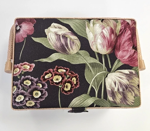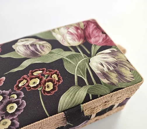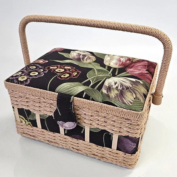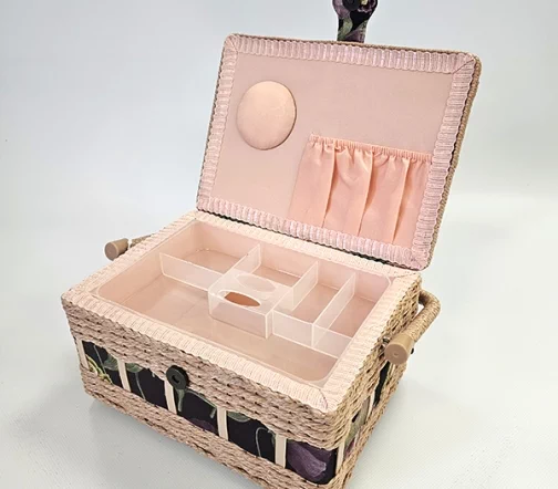 Шкатулка для рукоделия – незаменимый предмет для любой рукодельницы! В ней не только удобно хранить швейные принадлежности и аксессуары, такая шкатулка также станет прекрасным украшением интерьера! А еще это отличная идея для подарка тем, кто увлекается шитьем, вышиванием и другими видами рукоделия. Шкатулка обтянута тканью из 100% хлопка, имеет плетеную ручку для переноски и оплетку по периметру крышки. Внутри шкатулки на крышке закреплена подушечка для хранения игл, а также имеется внутренний контейнер из пластика с отделениями для хранения мелких аксессуаров.