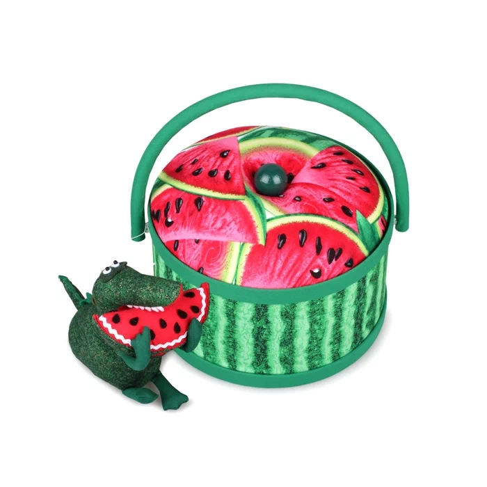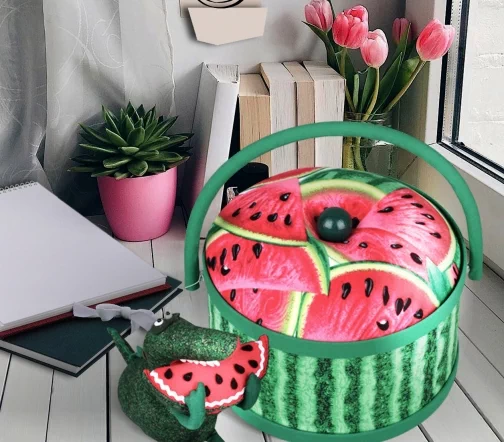 Шкатулка для рукоделия – незаменимый предмет для любой рукодельницы! В ней не только удобно хранить швейные принадлежности и аксессуары, такая шкатулка также станет прекрасным украшением интерьера! А еще это отличная идея для подарка тем, кто увлекается шитьем, вышиванием и другими видами рукоделия. Шкатулка обтянута тканью из 100% хлопка, имеет плетеную ручку для переноски и оплетку по периметру крышки. Внутри шкатулки на крышке закреплена подушечка для хранения игл, а также имеется внутренний контейнер из пластика с отделениями для хранения мелких аксессуаров. В комплект входит крокодильчик - игольница.