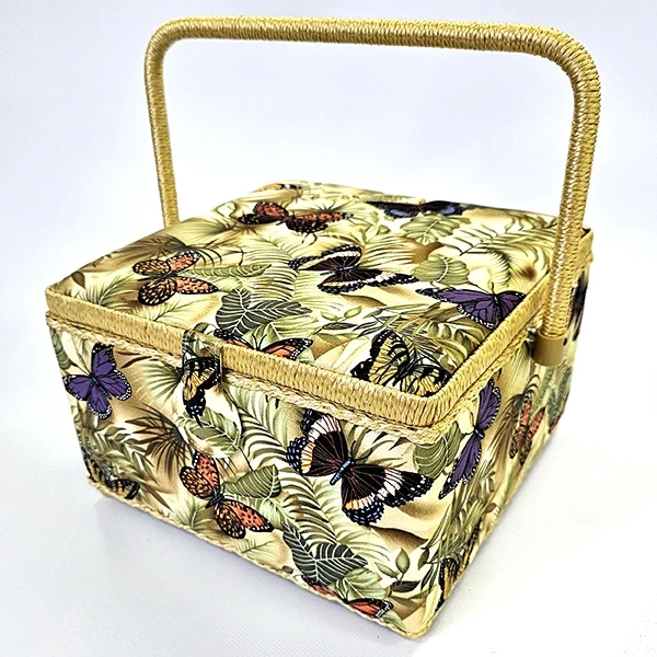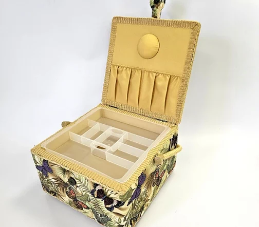 Шкатулка для рукоделия – незаменимый предмет для любой рукодельницы! В ней не только удобно хранить швейные принадлежности и аксессуары, такая шкатулка также станет прекрасным украшением интерьера! А еще это отличная идея для подарка тем, кто увлекается шитьем, вышиванием и другими видами рукоделия. Шкатулка обтянута тканью из 100% хлопка, имеет плетеную ручку для переноски и оплетку по периметру крышки. Внутри шкатулки на крышке закреплена подушечка для хранения игл, а также имеется внутренний контейнер из пластика с отделениями для хранения мелких аксессуаров.