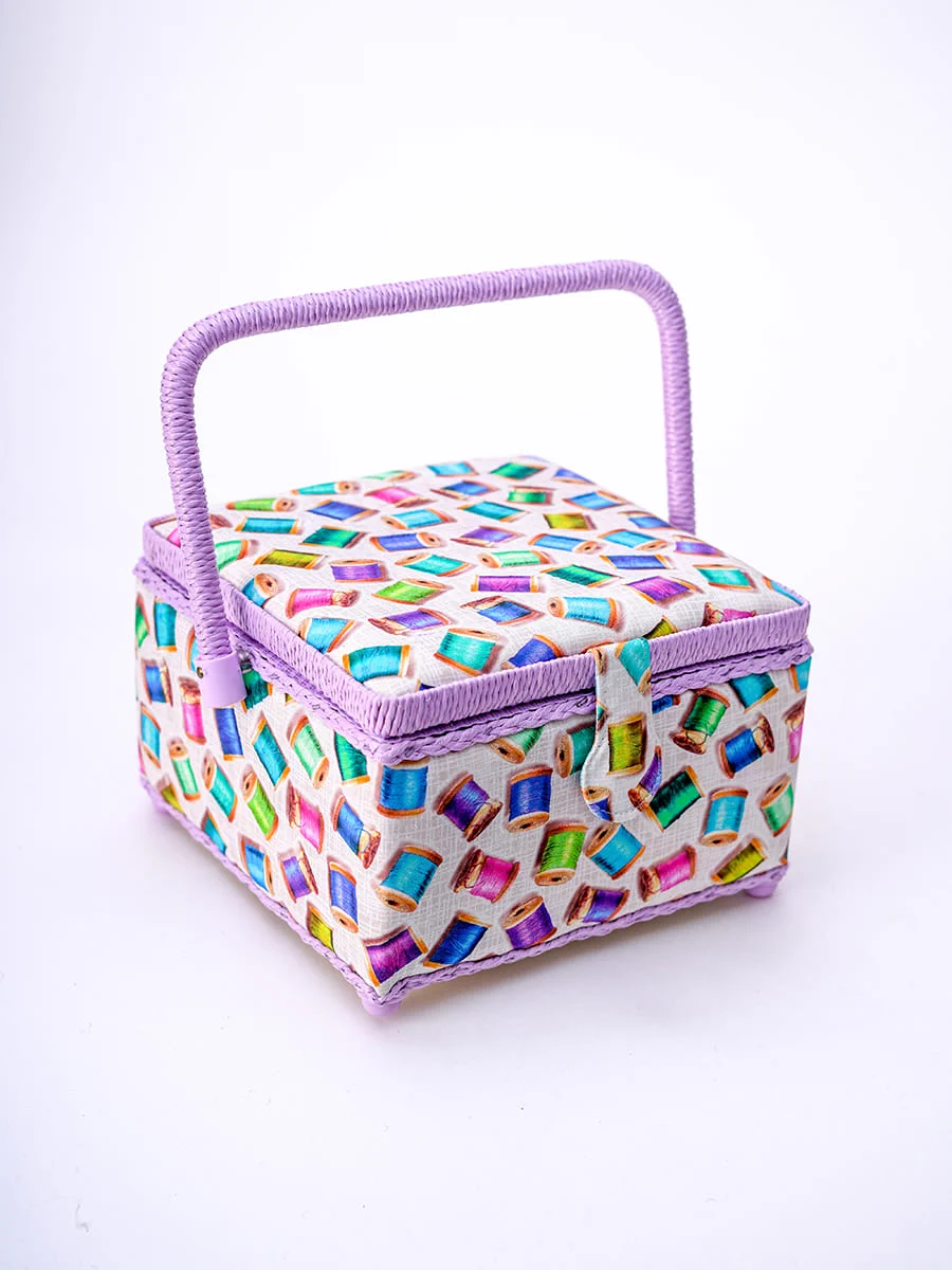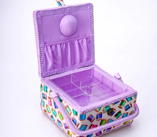 Шкатулка для рукоделия – незаменимый предмет для любой рукодельницы! В ней не только удобно хранить швейные принадлежности и аксессуары, такая шкатулка также станет прекрасным украшением интерьера! А еще это отличная идея для подарка тем, кто увлекается шитьем, вышиванием и другими видами рукоделия. Шкатулка обтянута тканью из 100% хлопка, имеет плетеную ручку для переноски и оплетку по периметру крышки. Внутри шкатулки на крышке закреплена подушечка для хранения игл, а также имеется внутренний контейнер из пластика с отделениями для хранения мелких аксессуаров.