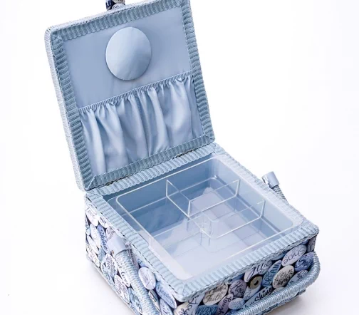 Шкатулка для рукоделия – незаменимый предмет для любой рукодельницы! В ней не только удобно хранить швейные принадлежности и аксессуары, такая шкатулка также станет прекрасным украшением интерьера! А еще это отличная идея для подарка тем, кто увлекается шитьем, вышиванием и другими видами рукоделия. Шкатулка обтянута тканью из 100% хлопка, имеет плетеную ручку для переноски и оплетку по периметру крышки. Внутри шкатулки на крышке закреплена подушечка для хранения игл, а также имеется внутренний контейнер из пластика с отделениями для хранения мелких аксессуаров.