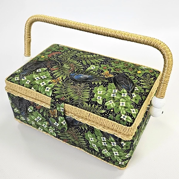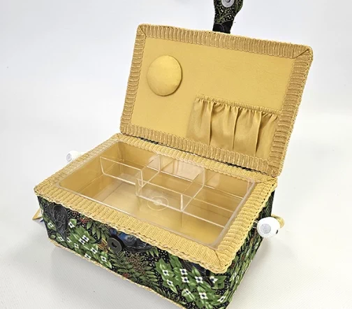 Шкатулка для рукоделия – незаменимый предмет для любой рукодельницы! В ней не только удобно хранить швейные принадлежности и аксессуары, такая шкатулка также станет прекрасным украшением интерьера! А еще это отличная идея для подарка тем, кто увлекается шитьем, вышиванием и другими видами рукоделия. Шкатулка обтянута тканью из 100% хлопка, имеет плетеную ручку для переноски и оплетку по периметру крышки. Внутри шкатулки на крышке закреплена подушечка для хранения игл, а также имеется внутренний контейнер из пластика с отделениями для хранения мелких аксессуаров.