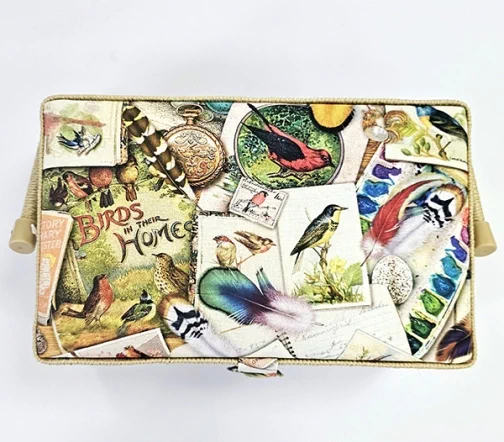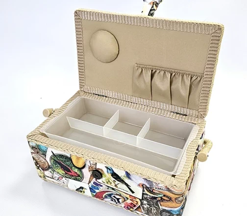 Шкатулка для рукоделия – незаменимый предмет для любой рукодельницы! В ней не только удобно хранить швейные принадлежности и аксессуары, такая шкатулка также станет прекрасным украшением интерьера! А еще это отличная идея для подарка тем, кто увлекается шитьем, вышиванием и другими видами рукоделия. Шкатулка обтянута тканью из 100% хлопка, имеет плетеную ручку для переноски и оплетку по периметру крышки. Внутри шкатулки на крышке закреплена подушечка для хранения игл, а также имеется внутренний контейнер из пластика с отделениями для хранения мелких аксессуаров.